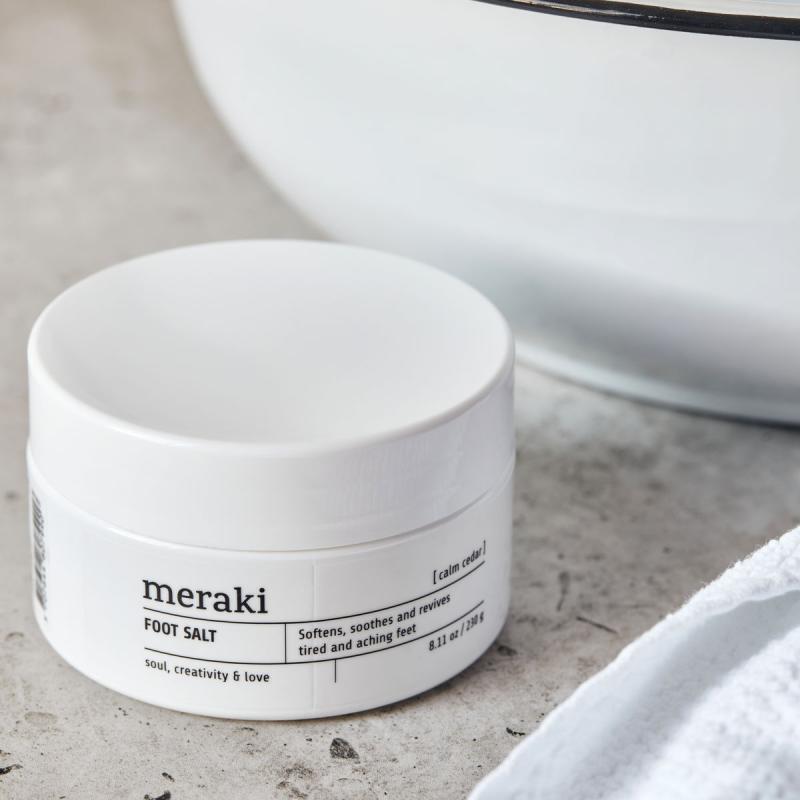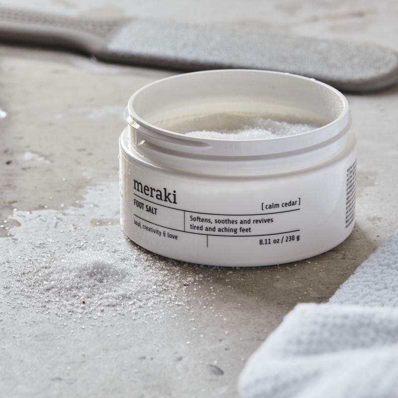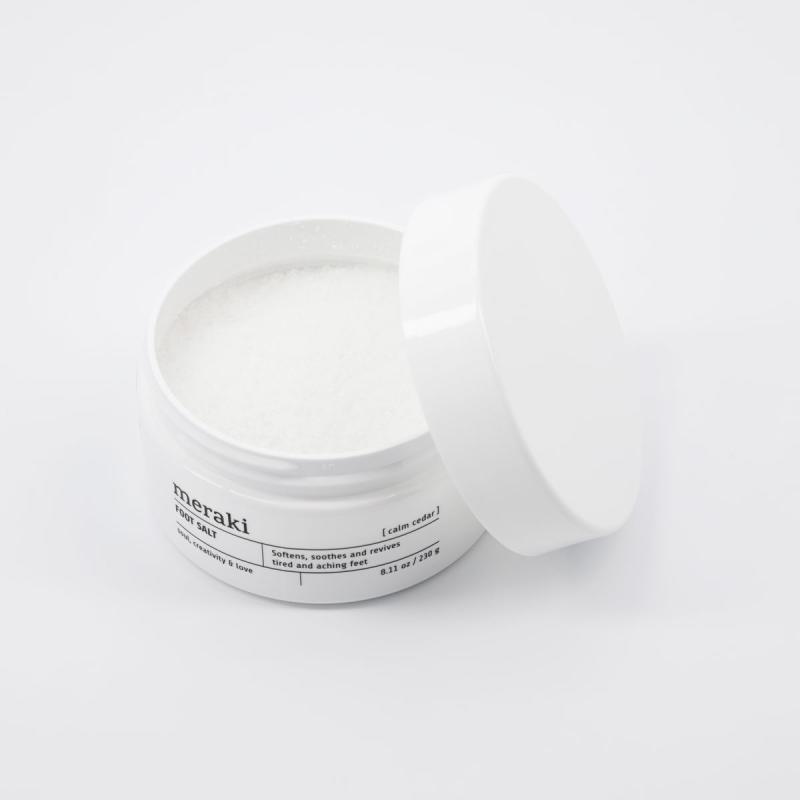 Revive tired and aching feet with this foot salt from Meraki. The salt called Calm Cedar is a sea salt which softens, soothes and revitalises your feet after a long day. Relax and take a well-deserved time out with a foot soak while you enjoy the energising scent of eucalyptus, mint and lime. Simply add the salt to a basin filled with lukewarm water and mix. We recommend 2-3 tablespoons for 5 litres. Soaking your feet is a simple and easy way of pampering yourself after work or when you simply want to enjoy a relaxing moment. Certified by ECOCERT Natural.