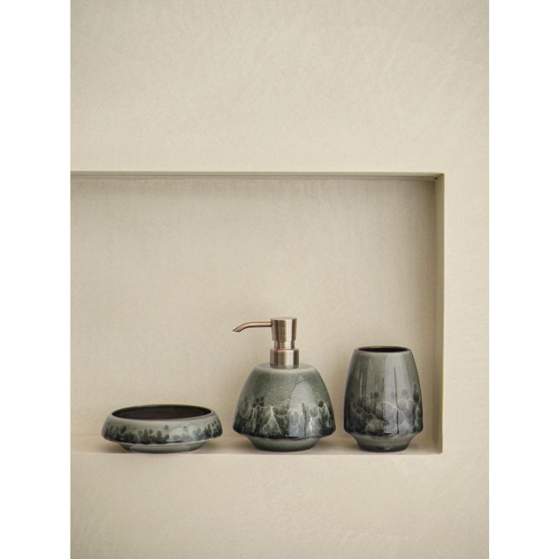 The Figo series of bathroom accessories features a reactive glaze in a dark green color. Reactive glazes are created by combining various materials that interact with each other during firing, resulting in unique and unpredictable patterns and colors. This means that each piece in the Figo series is truly one-of-a-kind.