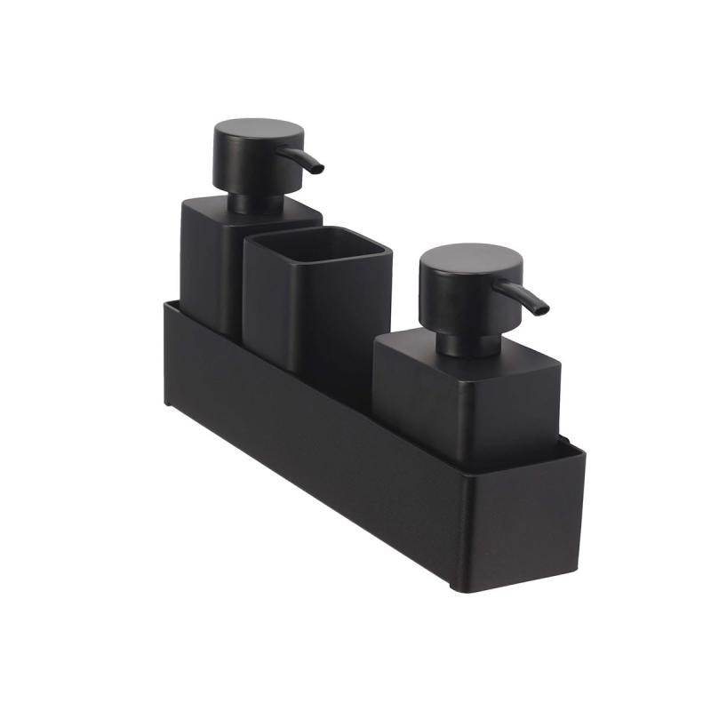 These bathroom accessories are made of polyresin, a durable material that is resistant to scratches and cracks. The polyresin has a matte finish that gives it a sophisticated look and a nice texture to the touch. The pump of the soap dispenser is made of stainless steel, which is a durable and rust-resistant material that provides a nice contrast to the polyresin.