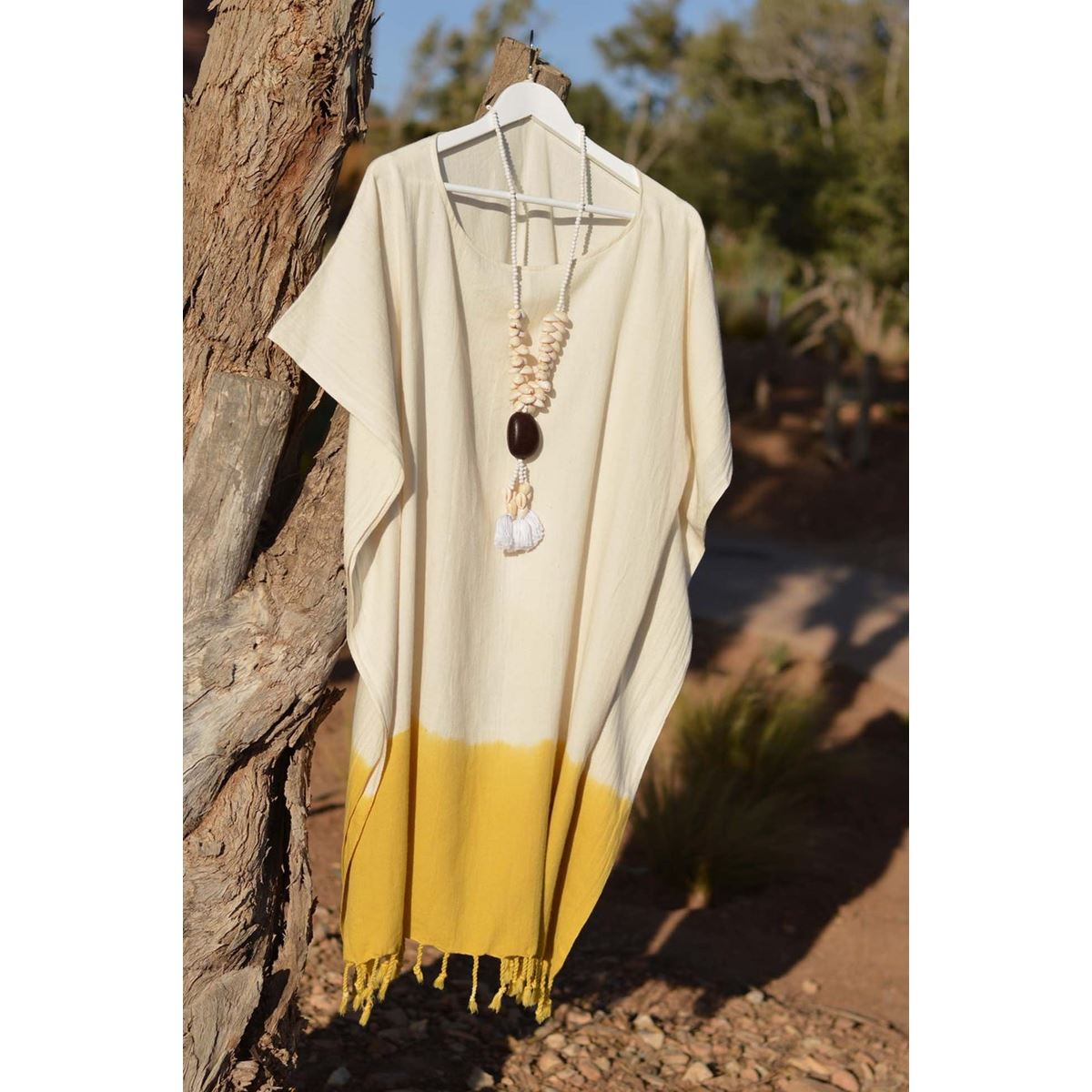 Get that instant boho-beach look with this stylish women’s beach dress TIE-DYE. The “one size fits all” summer beach dress has a simple and plain bohemian design, cleverly made from a handwoven hammam towel. The material is a blend of cotton and bamboo that gives it a lovely soft feel. The tie-dye treatment makes it 100% on trend. Get a hip and stylish look at the beach. Available in 3 different colors.