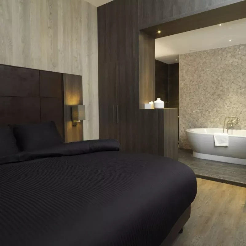 Hotel-Style Design: Subtle stripes and luxurious black color elevate your bedroom's style.