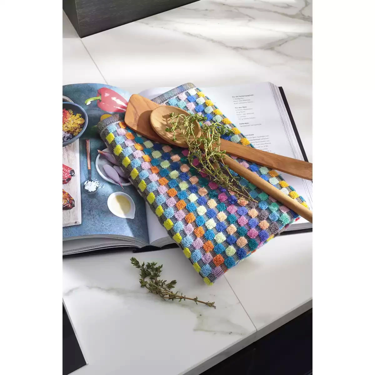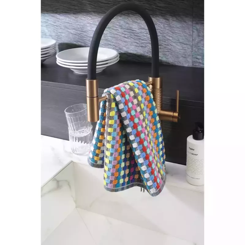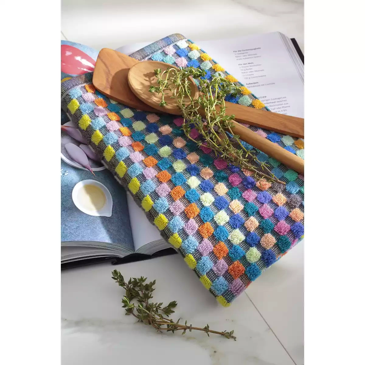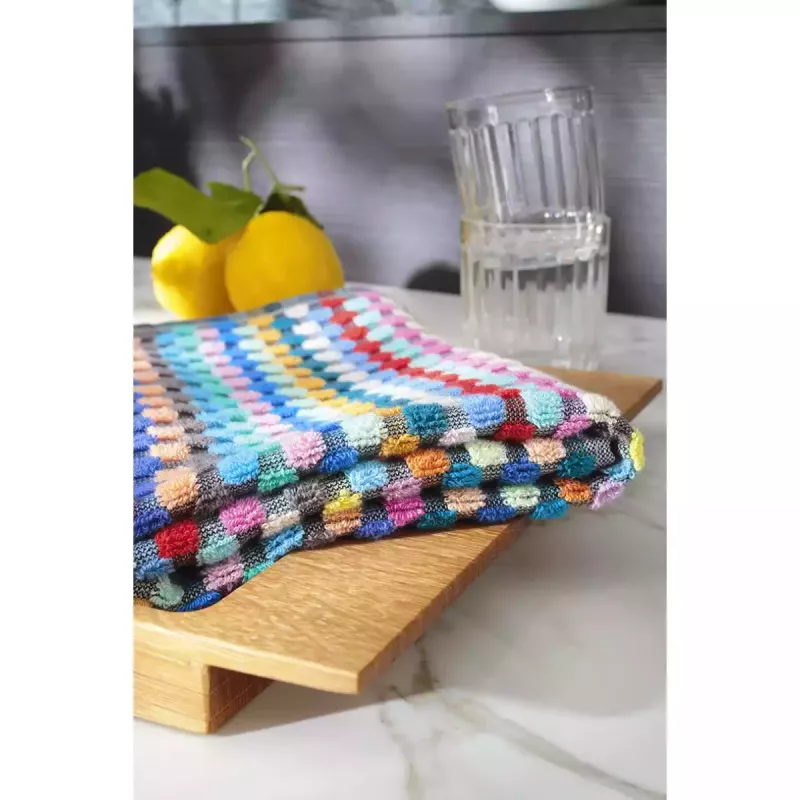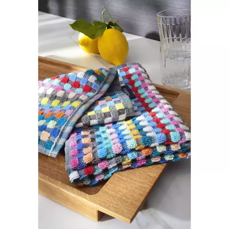 The distinctive high-low woven structure enhances absorbency, allowing the towel to efficiently capture moisture and deliver excellent drying performance. The colorful checkered Confetti Karo pattern adds a playful yet stylish touch to your kitchen, creating a warm and inviting atmosphere. Its versatile color palette makes it easy to combine with various kitchen textiles and interior styles.