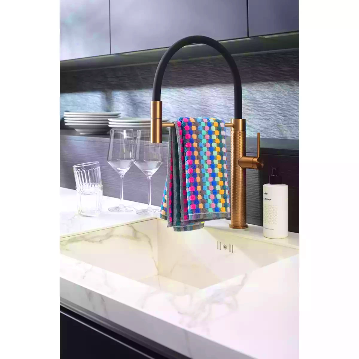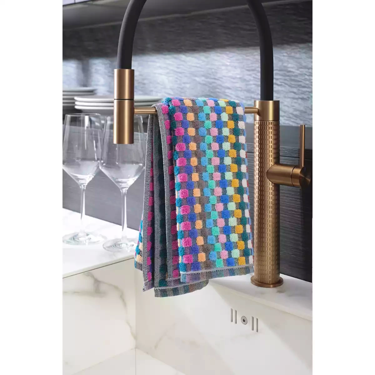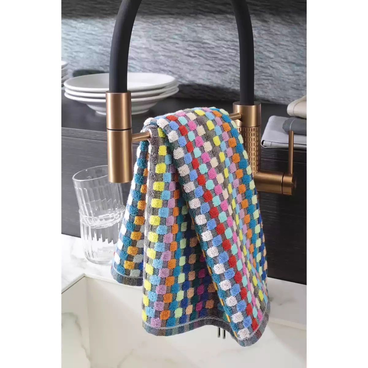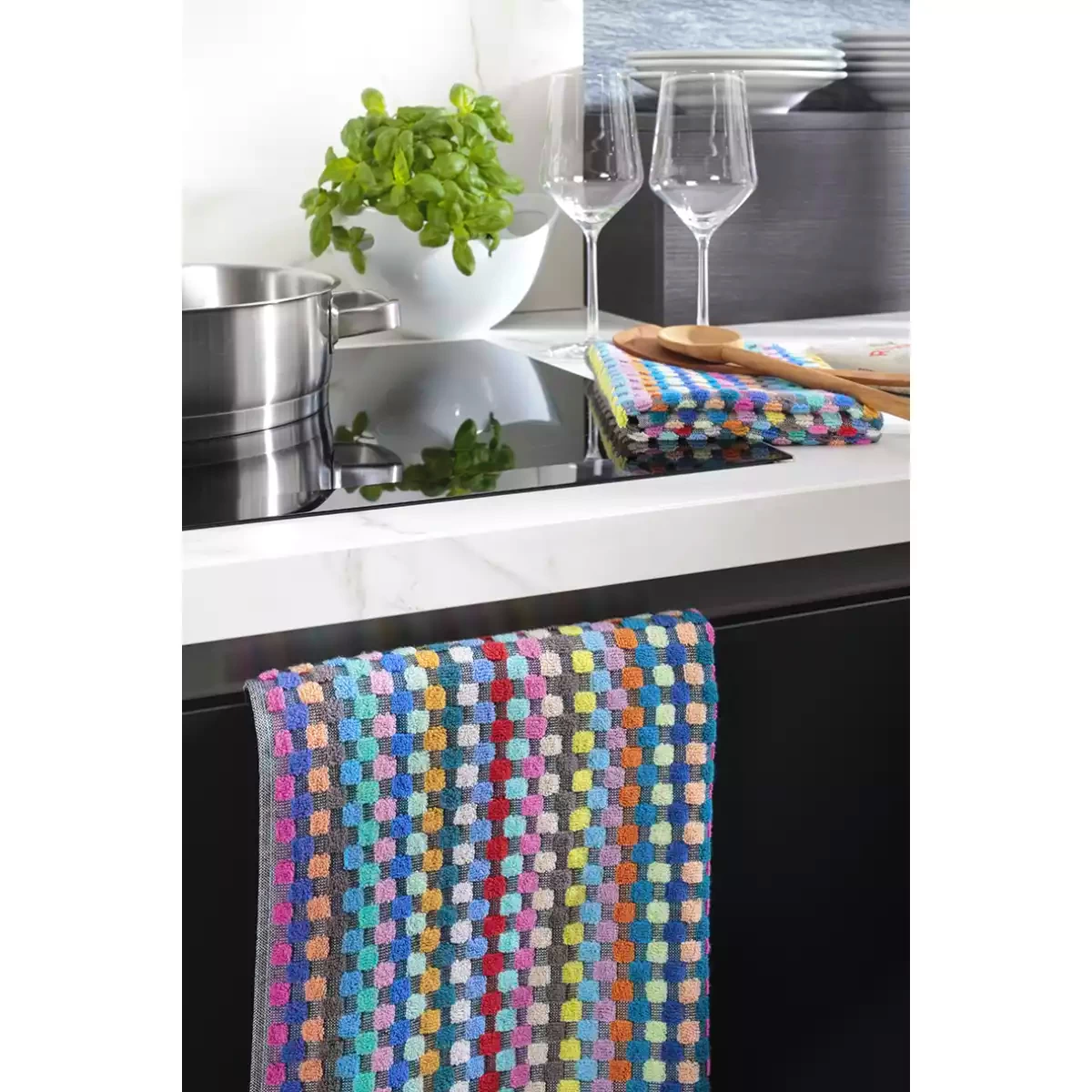 The distinctive high-low woven structure enhances absorbency, allowing the towel to efficiently capture moisture and deliver excellent drying performance. The colorful checkered Confetti Karo pattern adds a playful yet stylish touch to your kitchen, creating a warm and inviting atmosphere. Its versatile color palette makes it easy to combine with various kitchen textiles and interior styles.