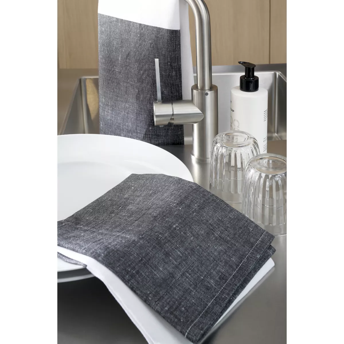 Crafted from a high-quality blend of 52% linen and 48% cotton, these towels offer an ideal balance of durability, absorbency, and comfort. Linen fibers ensure fast drying and long-lasting performance, while cotton provides softness and flexibility, making them perfect for everyday kitchen use. The black and white design creates a strong and refined contrast that fits perfectly in modern, minimalist, and Scandinavian interiors. This classic combination delivers a graphic and timeless aesthetic that is easy to combine with other colors and materials in the kitchen.