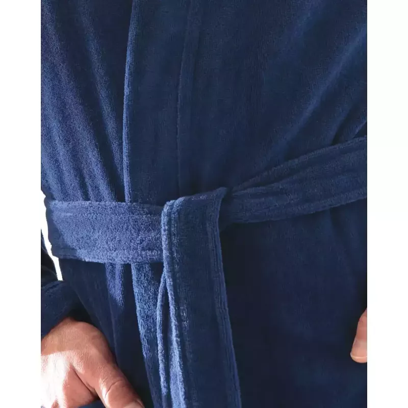 Featuring a minimalist design and a timeless blue hue, this kimono-style dressing gown exudes elegance and simplicity. The adjustable tie belt ensures a perfect fit around the waist, while maintaining the robe’s sleek silhouette and providing comfort and security.