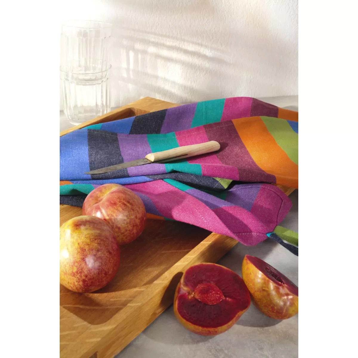 The robust weave efficiently absorbs moisture and dries quickly, making it a reliable companion for everyday kitchen tasks. It maintains its shape and performance even after frequent washing. The block striped pattern creates a strong visual structure that enhances an organized and stylish kitchen environment. The darker multicolor tones add a refined and understated elegance, suitable for both modern and classic interiors. With its practical size of 50x70 cm, the towel is versatile and ideal for drying hands, dishes, glassware, and kitchen surfaces, as well as serving as a decorative textile detail.