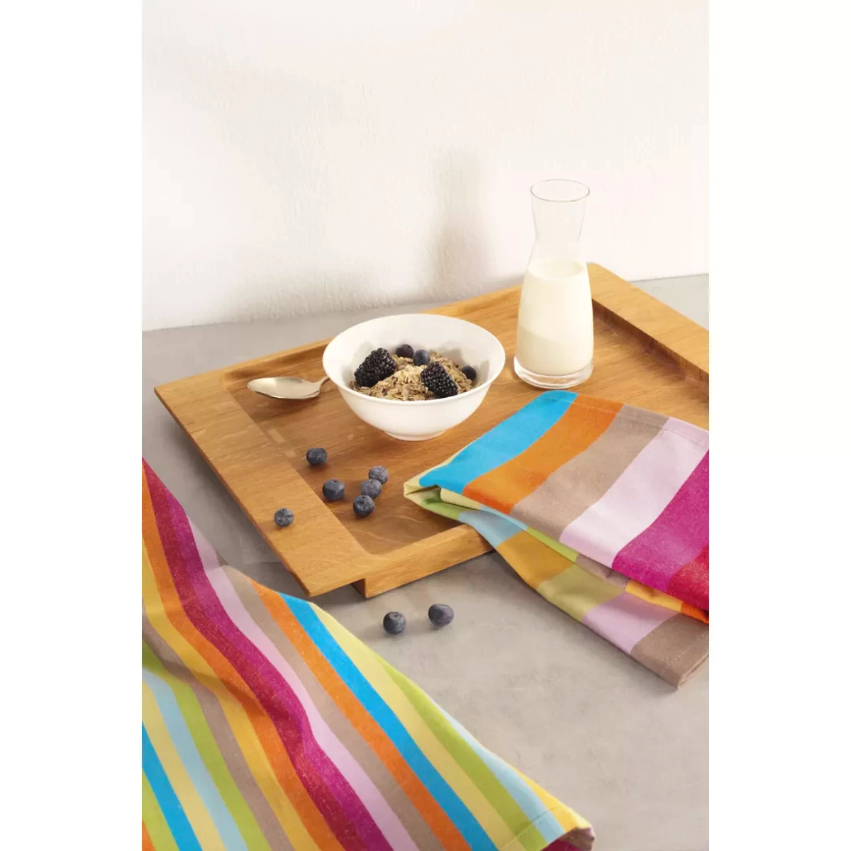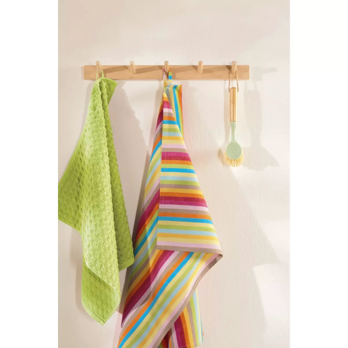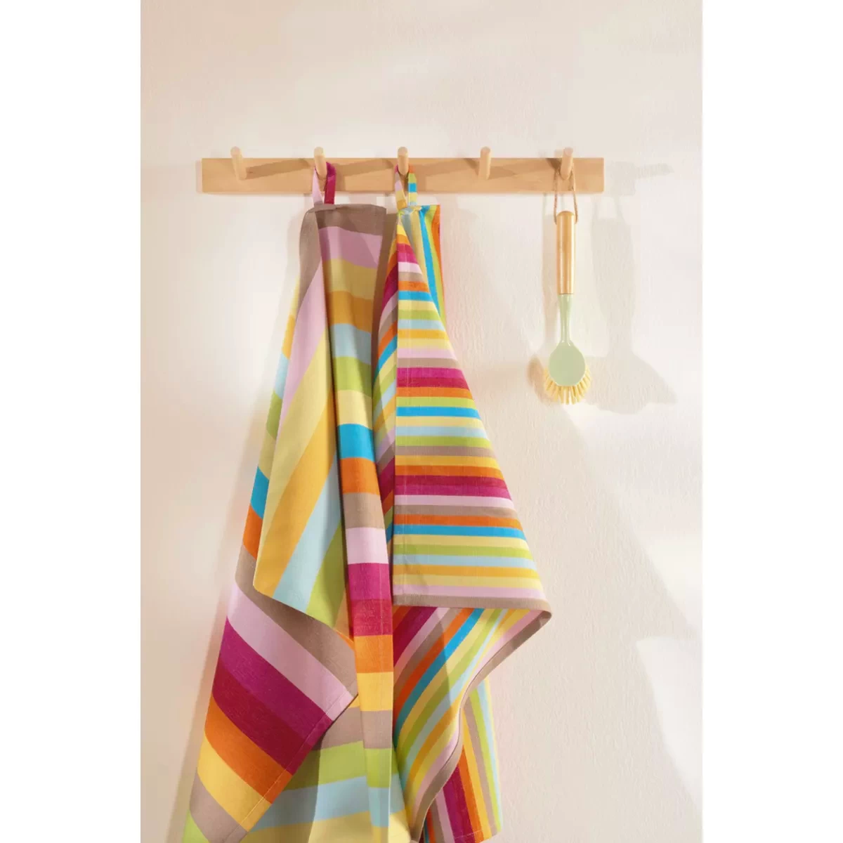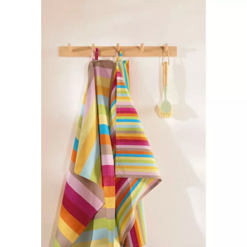 The absorbent fabric efficiently captures moisture, spills, and water, making it a reliable companion for daily kitchen tasks. It maintains its shape and performance even after repeated washing. The multicolor striped pattern is carefully designed to bring freshness and energy into the kitchen. The color combination creates a positive atmosphere while also serving as a decorative element. It is easy to match with other kitchen textiles and interior styles.
