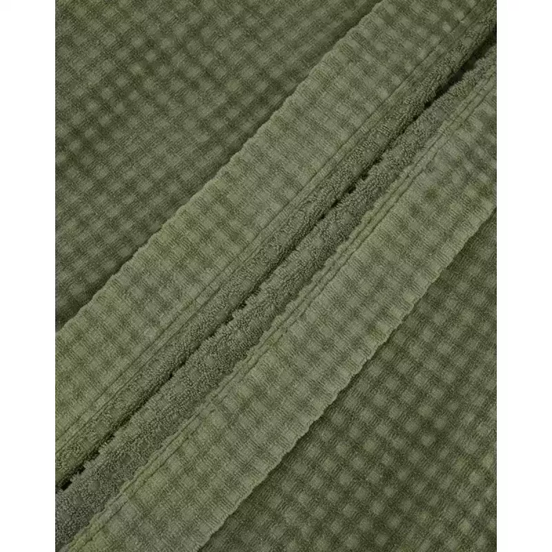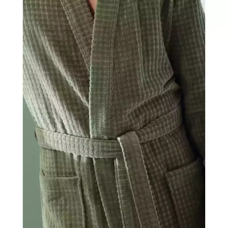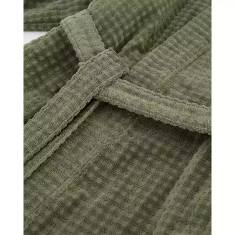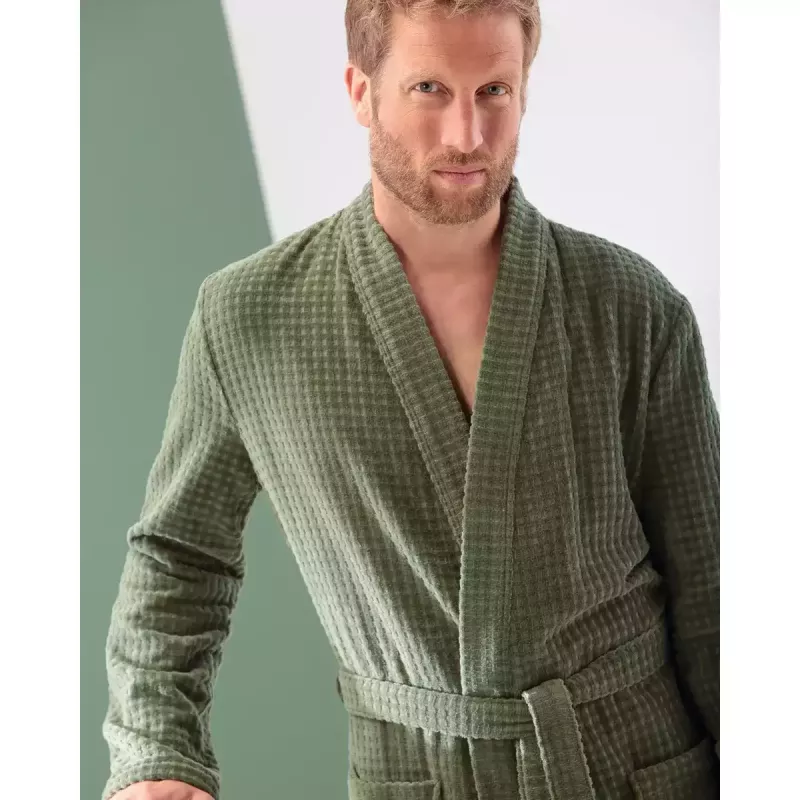 The robe's unique waffle pique design not only adds a sophisticated touch but also enhances the garment's breathability, making it an ideal choice for all seasons. Its timeless Field green color and subtle striped pattern provide a serene and natural aesthetic, suitable for any modern man's wardrobe.