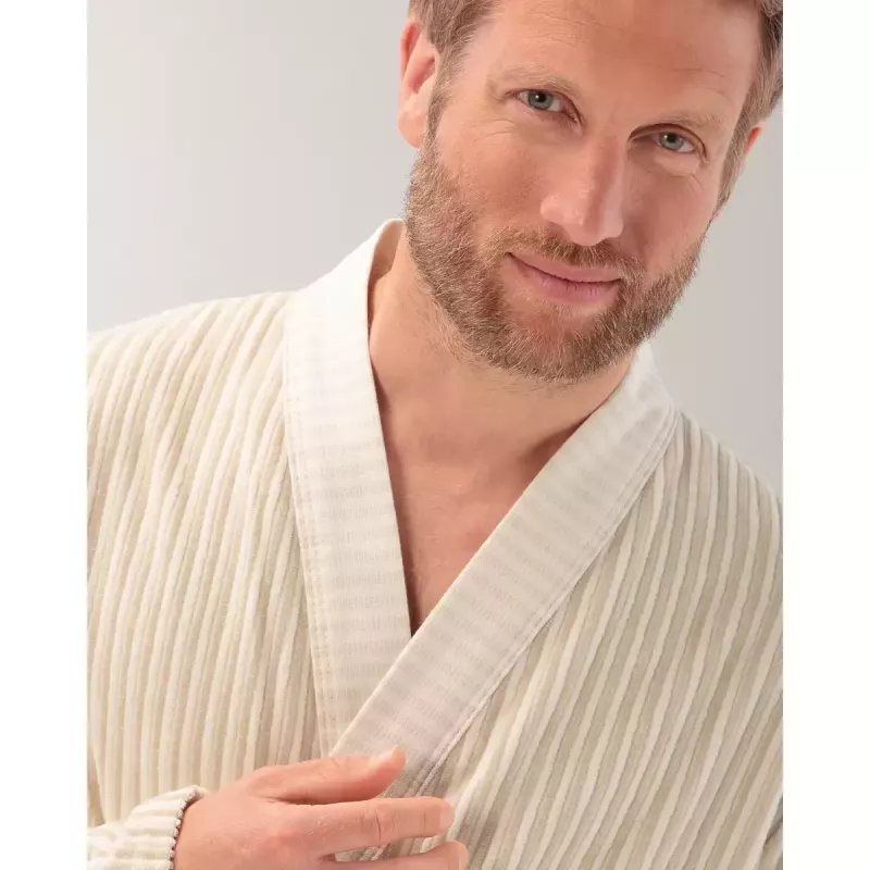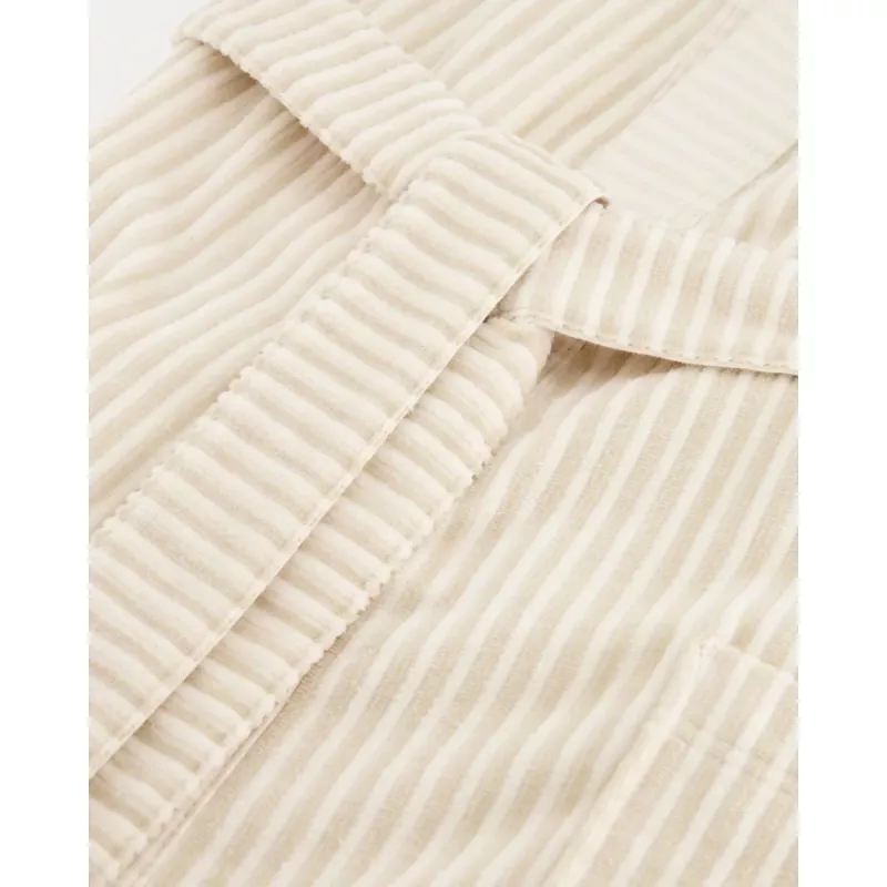 - Enjoy a timeless and elegant appearance with the robe's structured stripe design and natural beige color.