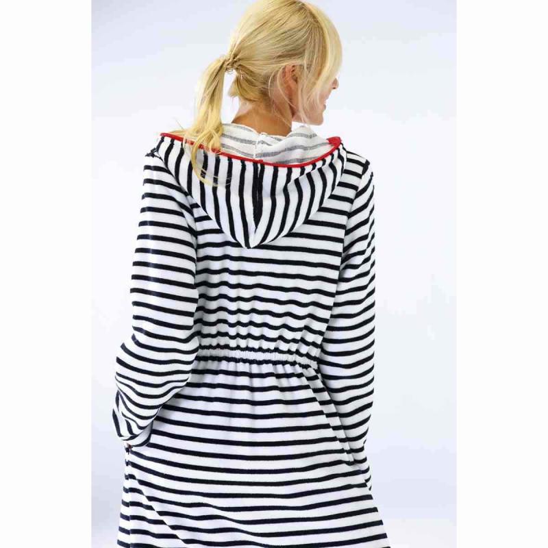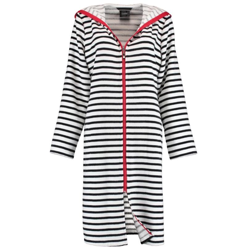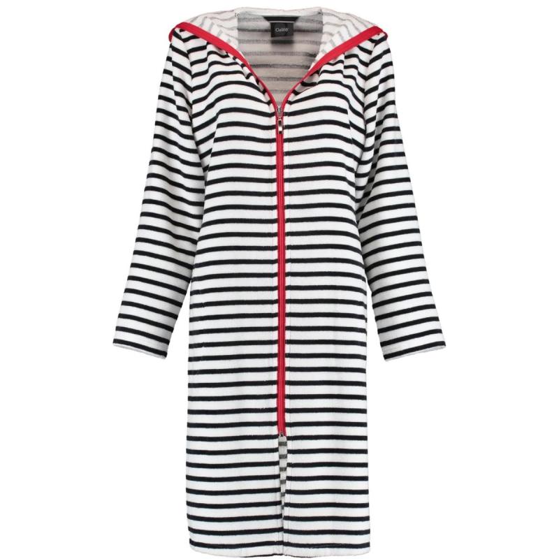 Experience the ultimate combination of style, comfort, and elegance with the Cawö Women's Short Bathrobe 1244-96 with an eye-catching red zipper and a cosy Hood in black and white stripes. Made with high-quality cotton, this bathrobe features a unique red zipper, easy cleaning, and a lightweight velour fabric. Available in sizes 36-46, it's the perfect choice for fashion-conscious women seeking a sporty and luxurious loungewear experience. Made in Germany.