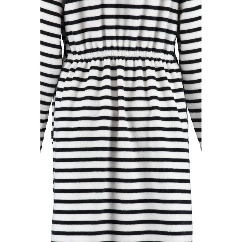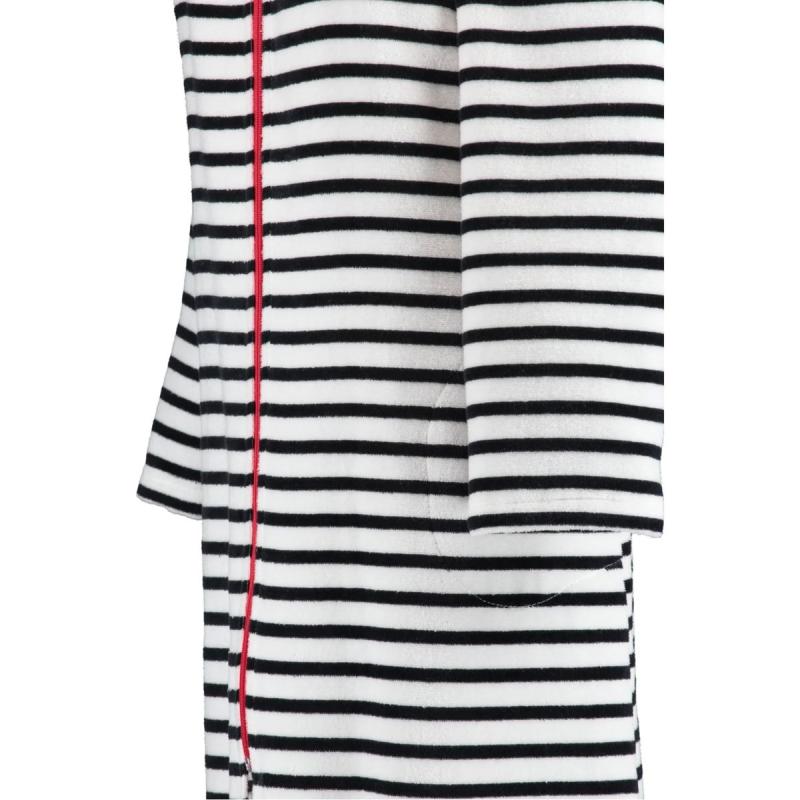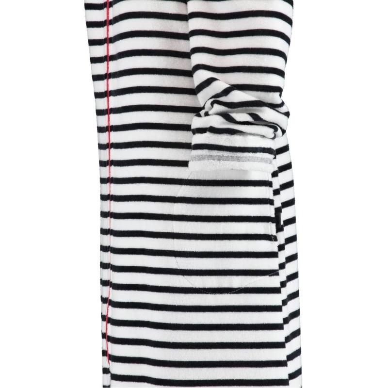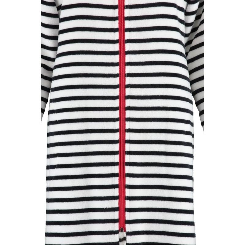 This Cawö Women's Bathrobe 1244-96 in the striking black and white stripe design is crafted with meticulous attention to detail, it showcases an eye-catching red zipper and luxurious velour quality that will make you feel pampered and relaxed. Made from 100% high-quality cotton, this bathrobe is not only easy to clean but also suitable for tumble drying. Let's delve deeper into the features that make this bathrobe a must-have addition to your collection.
