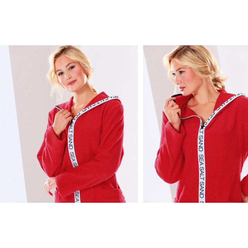 Searching for a high-quality stylish bathrobe? Discover the elegance and comfort of the Cawö Bathrobe Sea Salt Sand 3101-203 with zipper and hood in red.
