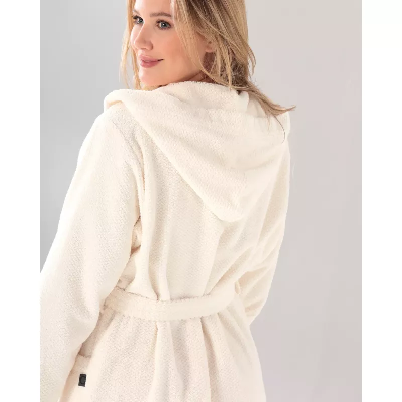 The Cawö Women's Bathrobe with Hood Pure 5223-356 redefines comfort with its relaxed hooded design and natural color palette, offering a beautiful blend of sporty elegance and luxury. The functional tie belt accentuates a feminine silhouette while the side pockets provide practicality for carrying small personal items.
