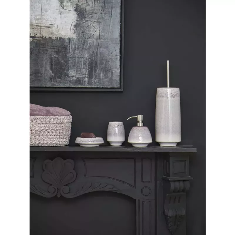 Crafted from glazed stoneware in a deep purple shade, each piece features a unique reactive glaze pattern – meaning no two soap dispensers are exactly alike. The matte stainless steel pump head adds a sleek and durable contrast to the ceramic body.
