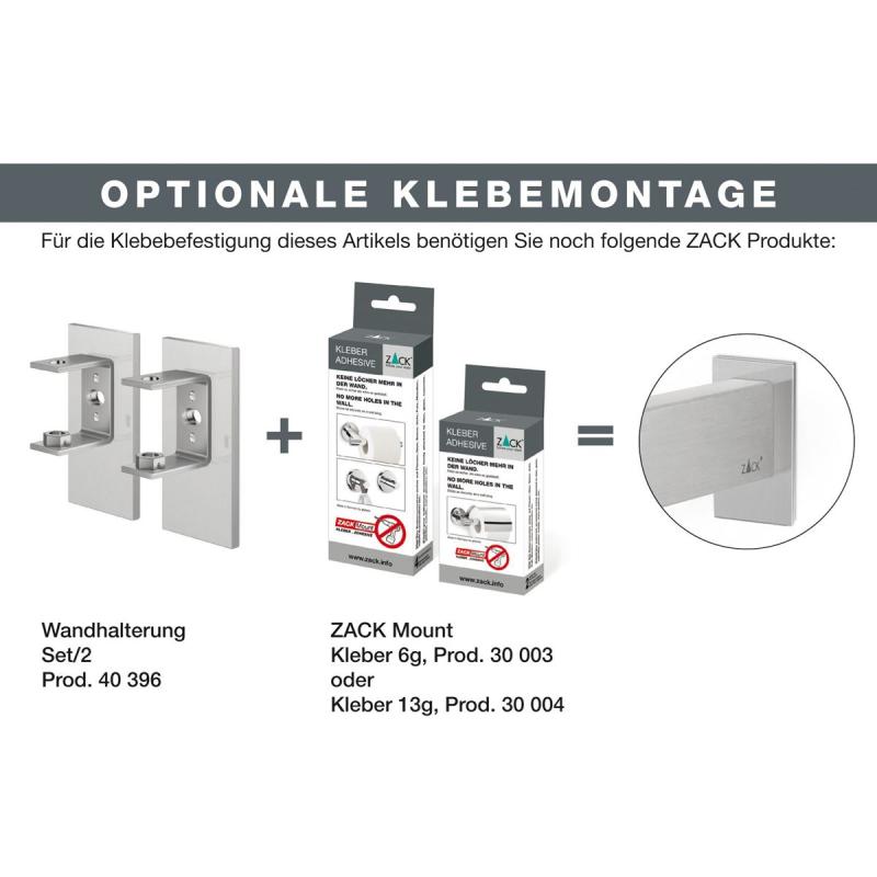 This wall-mounted towel rail, measuring 46.5 cm in width, 3 cm in height, and 7.7 cm in depth, is crafted from high-quality 18/10 stainless steel with a matte finish. Designed by ZACK, it offers both drilling and adhesive mounting options.