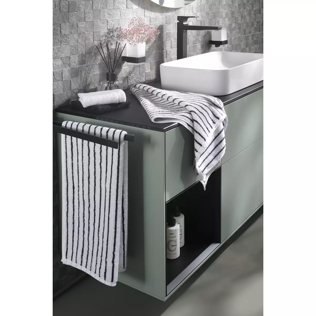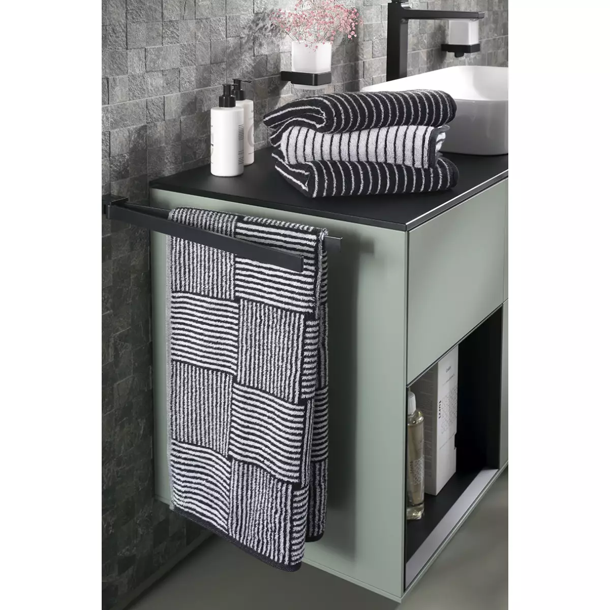 Striped Towel Black and White 6278-96 adds character to the visual atmosphere of the bathroom through the colour black/white and the Streifen design from the Black&White collection. Within a bathroom setting where textiles influence the overall style, Striped Towel Black and White 6278-96 creates focus on the visual balance of the room.