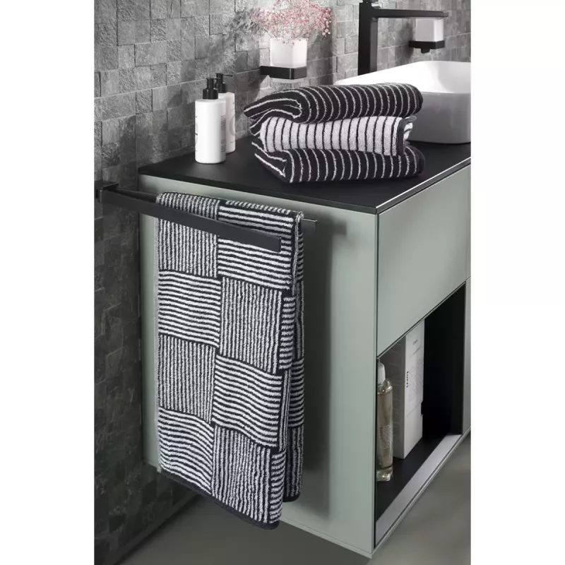 The tone black/white together with the Streifen pattern emphasises the identity of the towel and allows it to function as a design element. By combining the Black&White range, the Streifen design and the colour black/white, Striped Towel Black and White 6278-96 becomes a textile that participates in shaping the character of the bathroom interior.