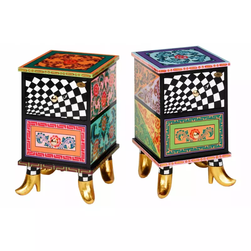 A Chic and Functional Addition to Your Home - The Toms Drag Bedside Table or Nightstand Aruba 101758 is a charming, handcrafted piece that adds both style and functionality to any room. Designed by Toms Drag, a brand known for its artistic approach to furniture, the Aruba nightstand is the perfect accent piece for your bedroom, living room, or hallway. Made from MDF wood and featuring golden shoes, this stunning table combines practicality with unique, eye-catching design.