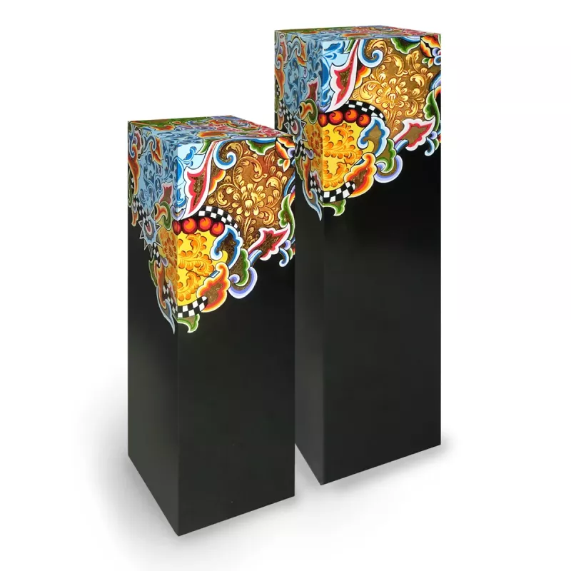 A Handcrafted Black & Gold Designer Pedestal - Elevate your interior with the Toms Drag Column L 4475, a handmade and hand-painted decorative pedestal that combines elegance, versatility, and artistic craftsmanship. Standing 100 cm tall, this sleek black column features signature Toms Drag gold embellishments and intricate Drag-style patterns on the top, making it a stunning display piece for sculptures, vases, plants, or other decorative objects.
