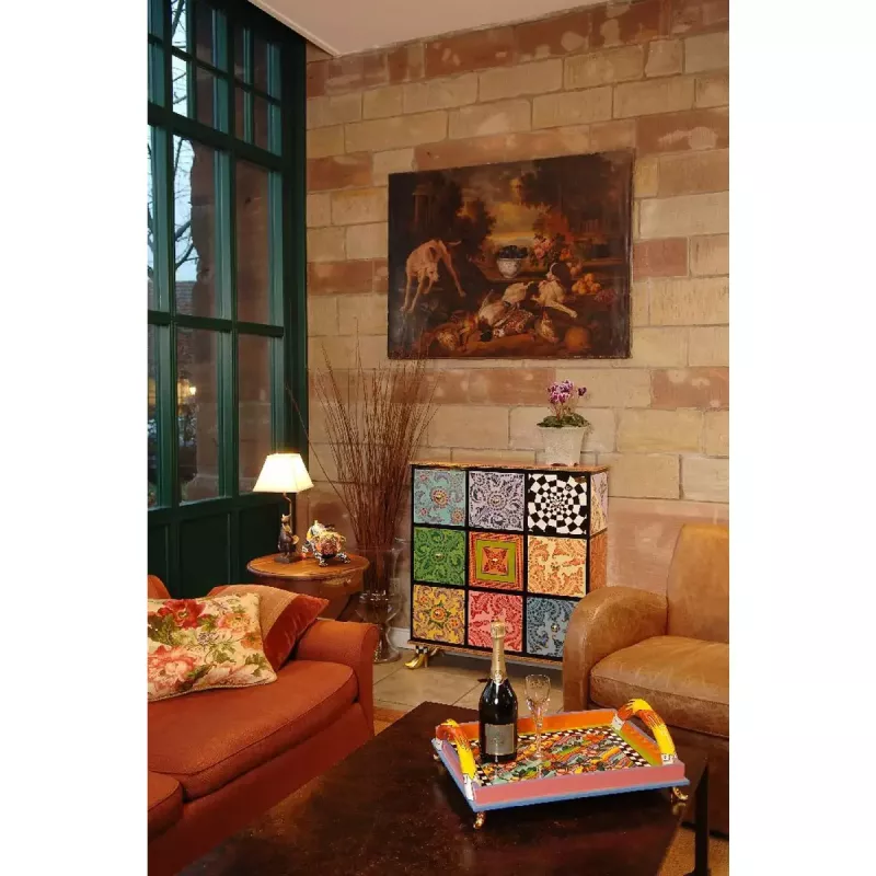 Creative and colorful design: Each chest is hand-painted with Toms Drag’s iconic playful patterns, bold colors, and elegant gold accents, making it a statement piece in any room.