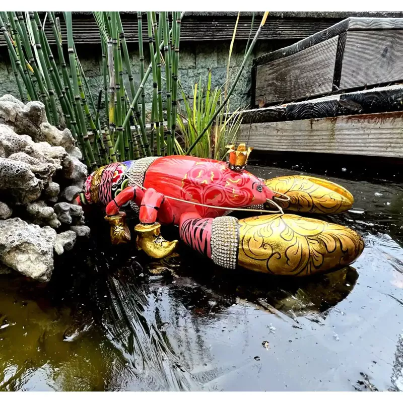 A Handcrafted Orange-Red Lobster Sculpture with Golden Claws and Rhinestone Details - Add a playful, vibrant, and whimsical touch to your home with the Toms Drag Lobster Edward L 4569. This large orange-red lobster sculpture is part of the Toms Drags Spring 2023 collection and is designed to make a bold statement in any space. Featuring golden claws decorated with rhinestones, golden booties, and a golden crown, Edward exudes luxury and humor. Handcrafted from Marmorin (a high-quality resin and marble dust blend), this 100% handmade lobster sculpture is as charming as it is unique. Its relaxed stance and cigarette give it a fun, carefree personality—perfect for adding character to your living room, dining room, or office.