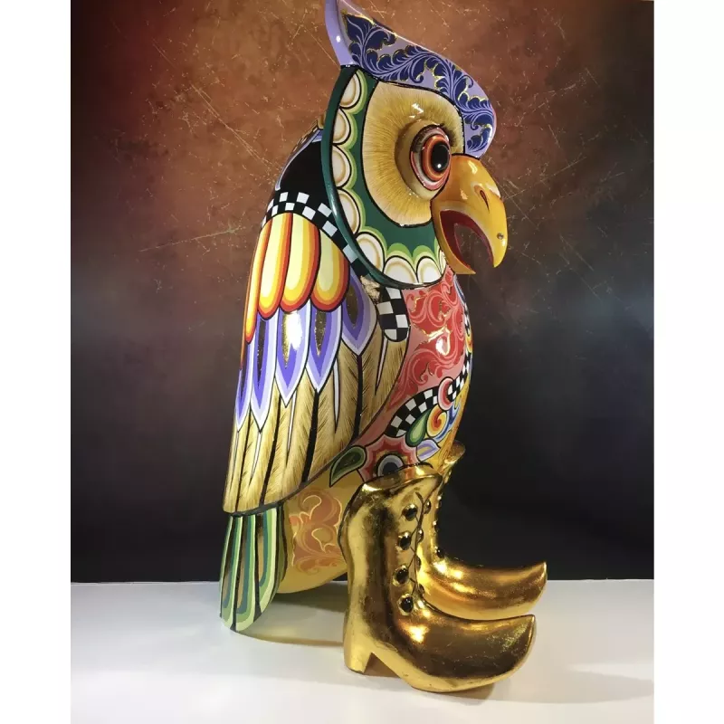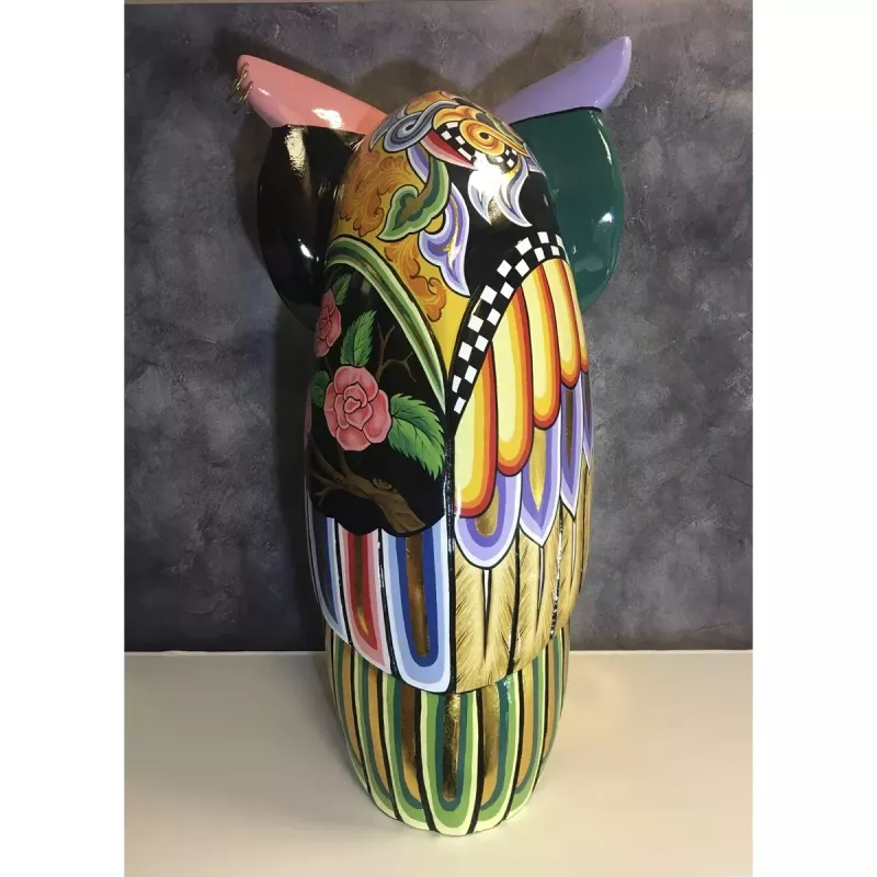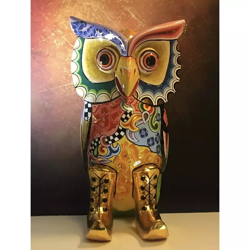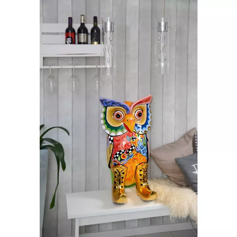 Crafted from high-quality fiberglass, Owl Hugo XXL stands 77 cm tall and is meticulously hand-painted with intricate Toms Drag patterns and vivid colors. The golden boots add a regal touch, making this sculpture a fascinating conversation piece for luxury homes, contemporary spaces, and art-inspired interiors.