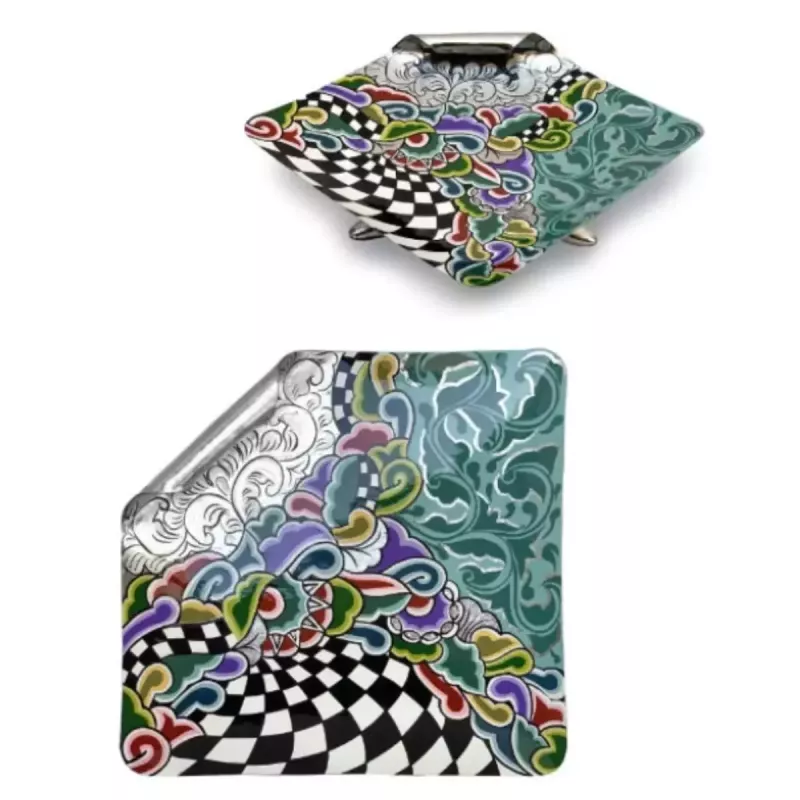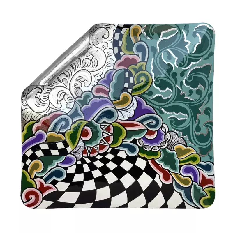The Platter Wave L Silver Line features a flat square design, resting on signature silver shoes, giving it an artistic and luxurious touch. Decorated with hand-painted exotic patterns and shimmering silver leaf accents, this decorative bowl blends sophisticated style with playful creativity, making it an eye-catching addition to any interior.