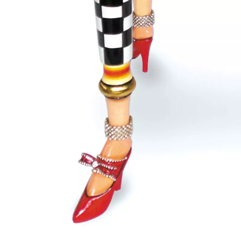 - Each leg stands on a striking red shoe