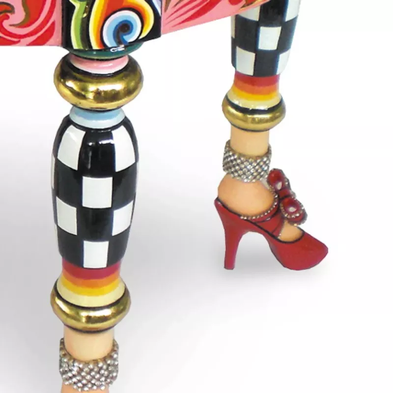 This round side table features a sturdy MDF wood construction and stands at 40 cm in height with a 45 cm diameter tabletop. Each of the four intricately designed legs is adorned with rhinestone ankle straps above the signature red shoes, adding a luxurious touch.