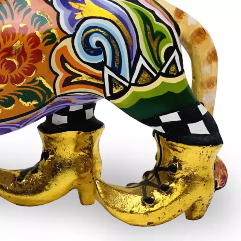 This quirky and elegant tiger figurine features a regal crown, golden boots, and intricate hand-painted patterns in vibrant rainbow colors. With exaggerated whiskers, delicate eyelashes, and whimsical ornaments, the Toms Drag Tiger Shir Khan is a playful yet luxurious addition to any décor. The gold leaf accents add a touch of extravagance, making this piece a striking focal point in any room.