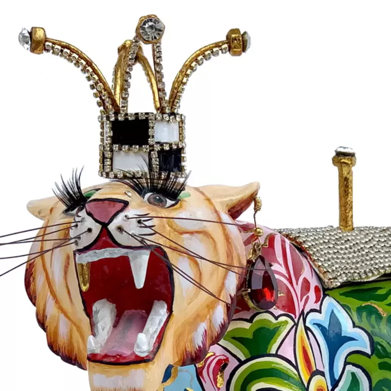 Inspired by the majesty of the tiger, this Toms Drag jewelry box features a colorful hand-painted finish, a crown-adorned rhinestone-studded lid, and golden boots, making it a fun yet elegant accent piece. With whimsical details like eyelashes and whiskers, this quirky yet stylish storage box is both decorative and functional.