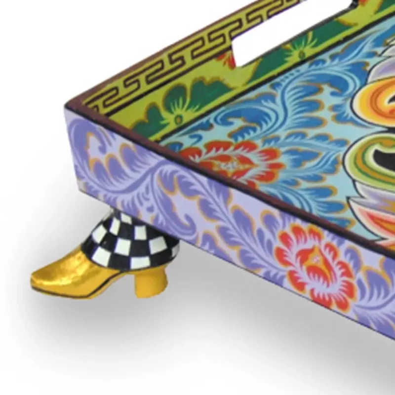 A Whimsical & Artistic Serving Tray - Looking for a unique and extravagant serving tray to elevate your home decor? The Toms Drag Tray M 4050 is a true statement piece, featuring a bold hand-painted design, vibrant colors, and playful golden shoes as legs. Whether you use it as a decorative tray, serving platter, or centerpiece, this square wooden tray adds charm, artistry, and luxury to any space.