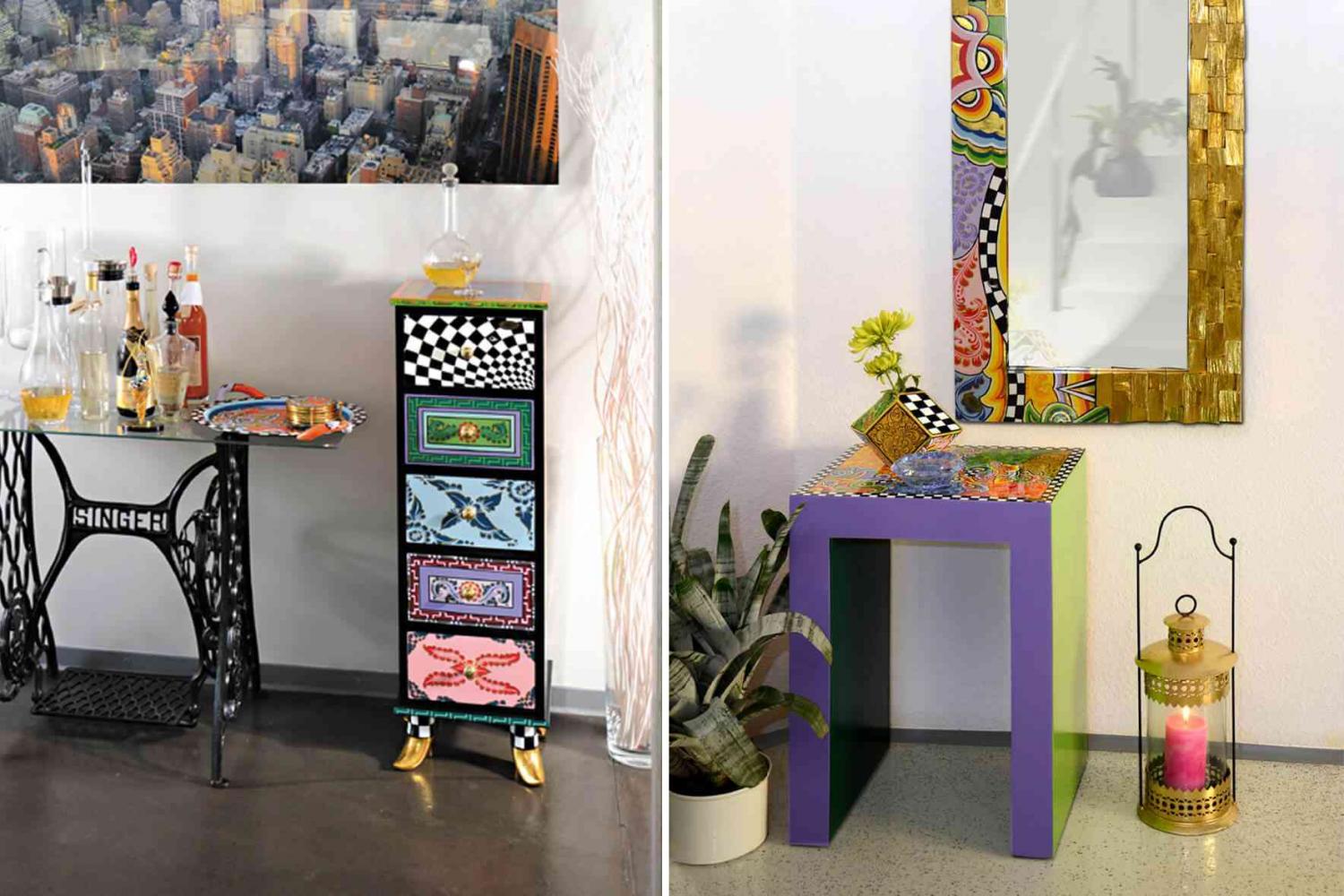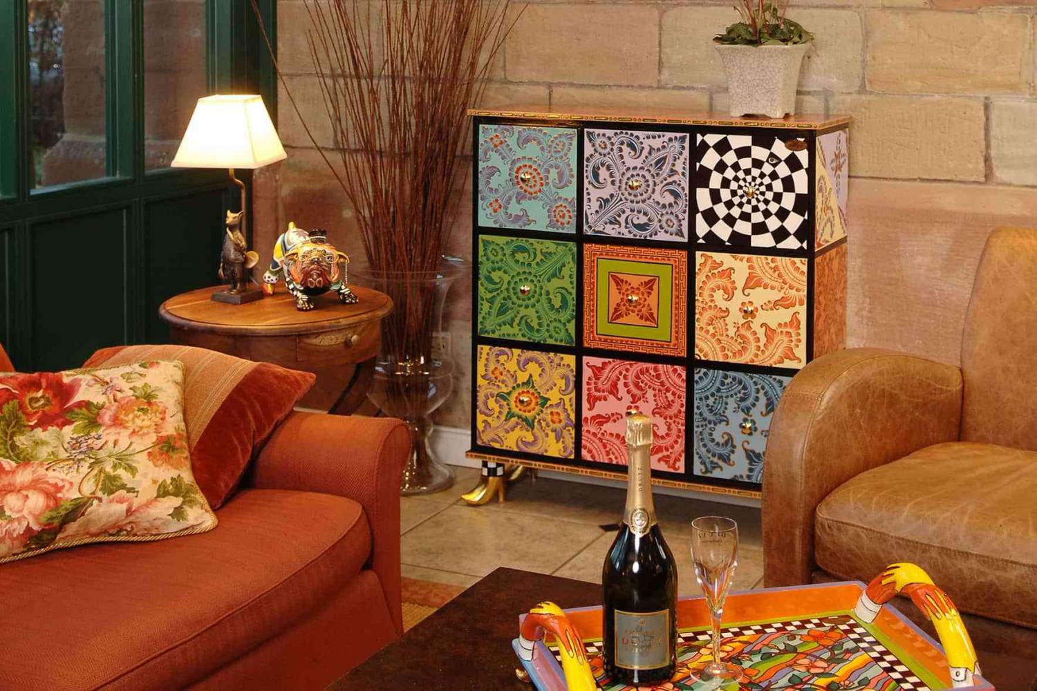 Handcrafted 67 cm chest with vibrant colors, golden accents, and charm.