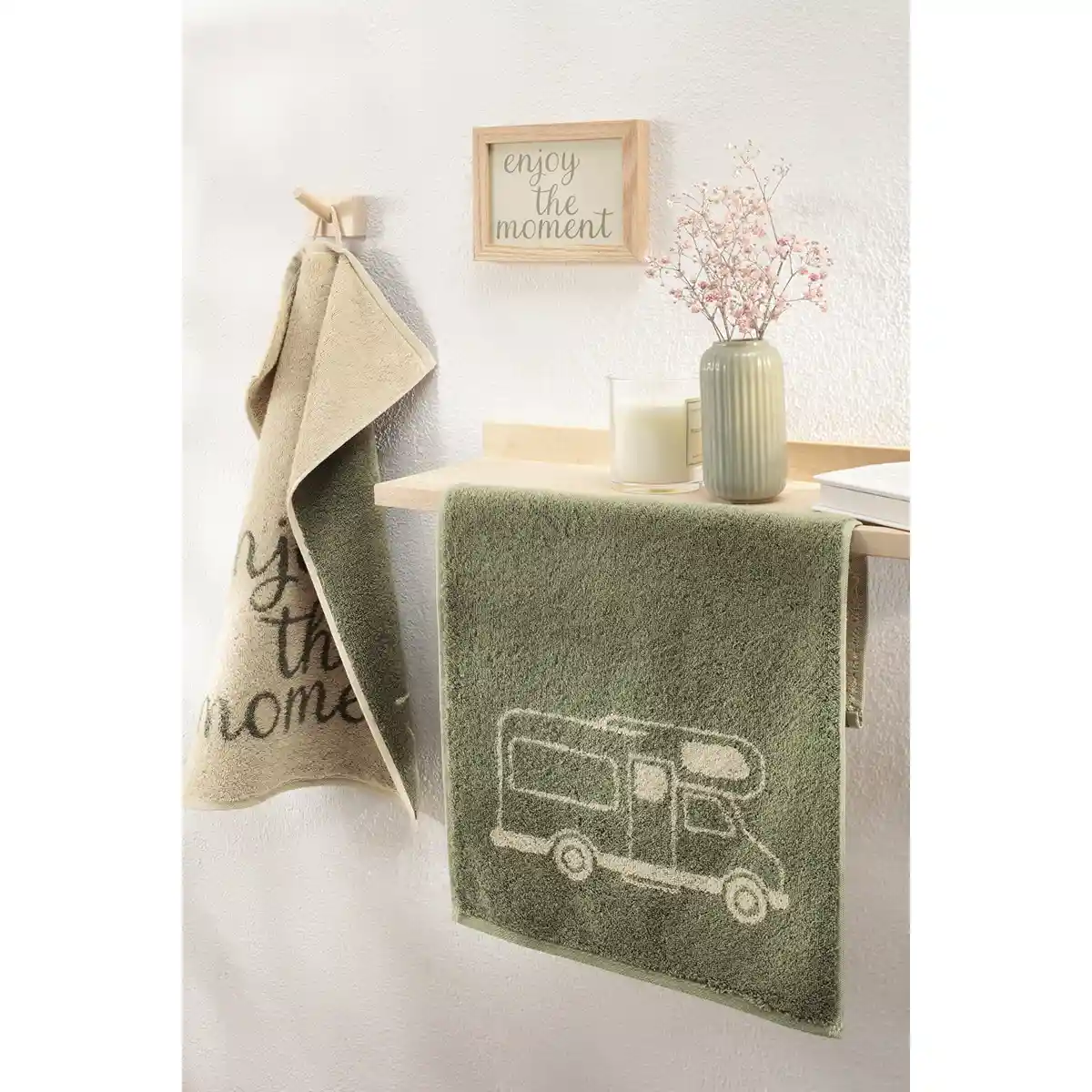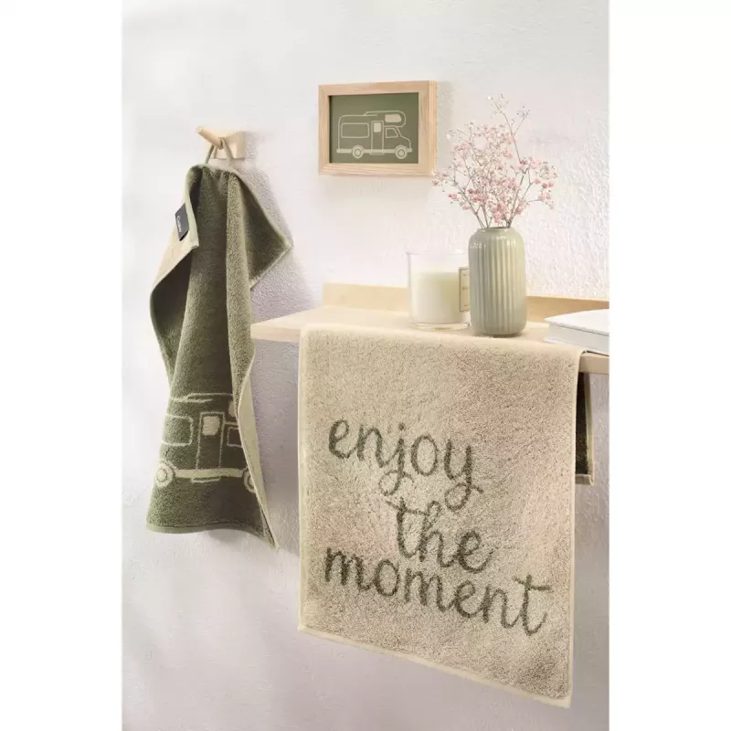 Its compact size makes it practical next to the sink where a smaller towel is needed for drying hands or face. The format also makes it easy to pack when travelling. The green tone creates a natural atmosphere reminiscent of forests, campsites and relaxing summer journeys.