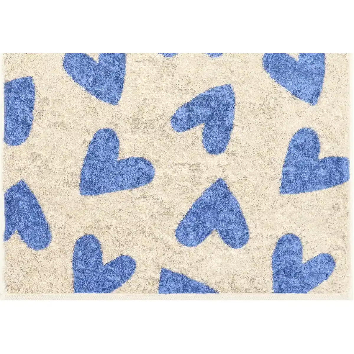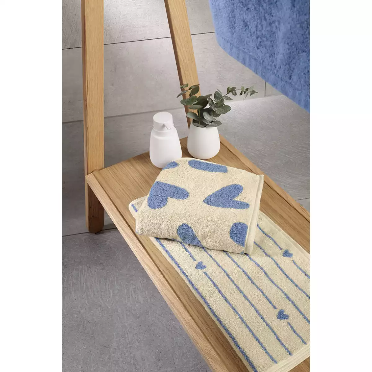 The tone Capri (blue) together with the Hearts pattern anchors the style of the identity of the towel and allows it to function as a design element. By combining the Heart Beats range, the Hearts design and the colour Capri (blue), Towel Heart Beats 6275-31 Capri becomes a textile that participates in shaping the character of the bathroom interior.