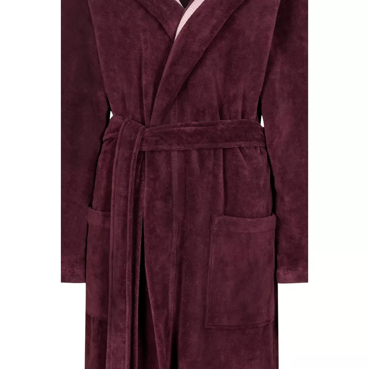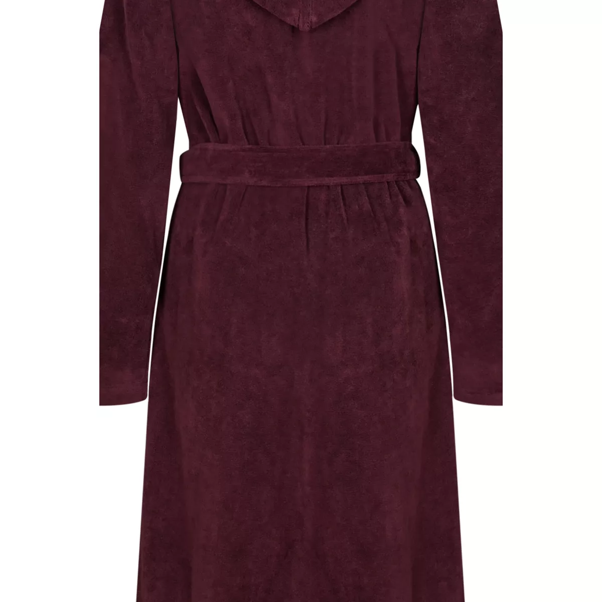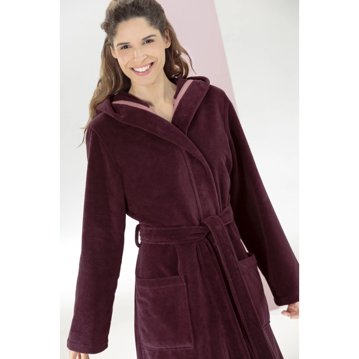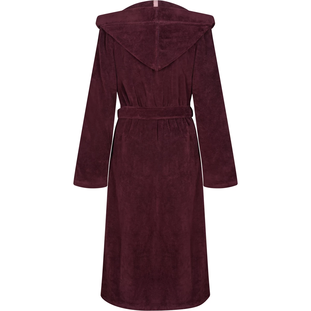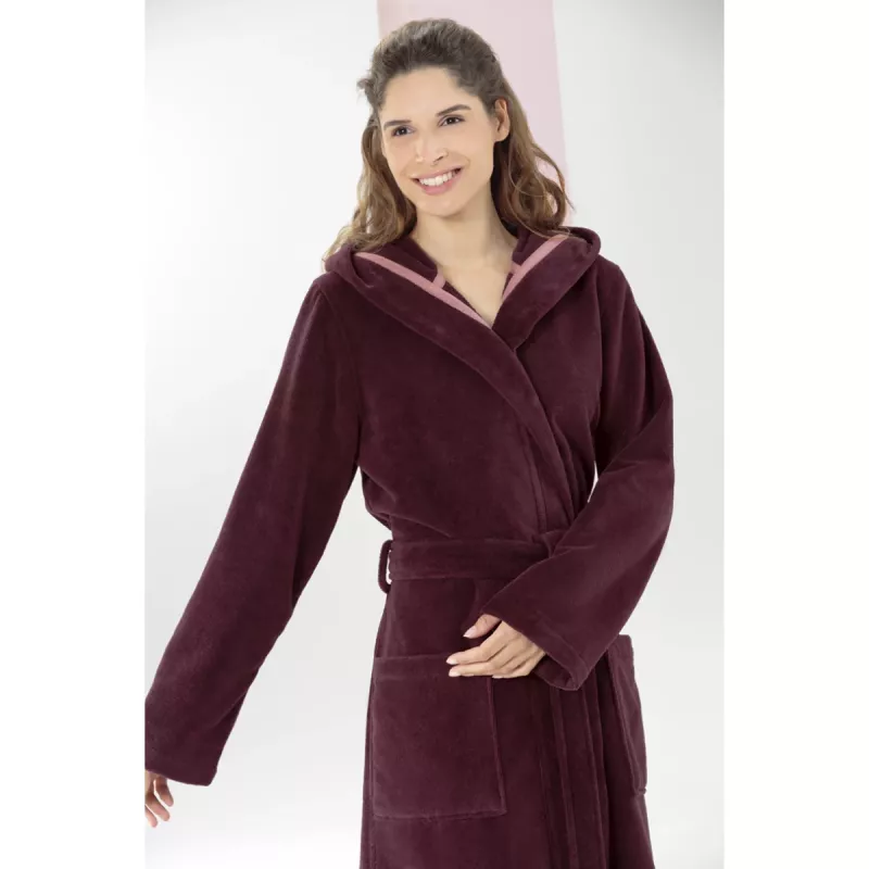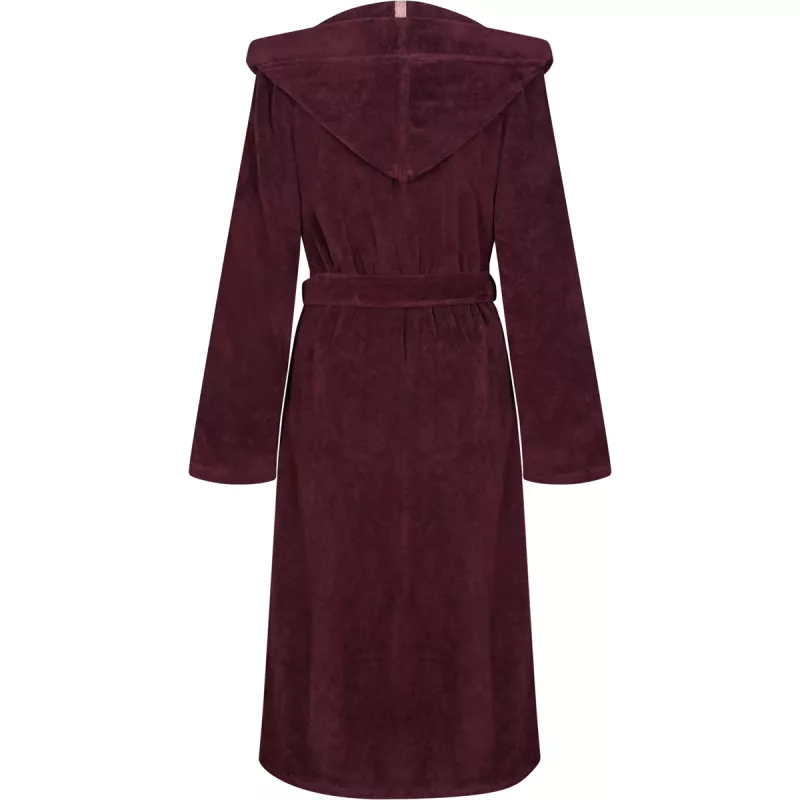 Women’s burgundy hooded velour bathrobe with belt by Cawö Home