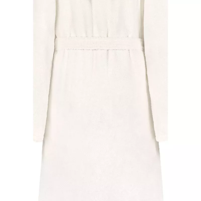 The practical hood provides extra warmth and comfort, while the tie belt at the waist highlights a feminine silhouette. With a length of approximately 115 cm, this robe offers perfect coverage and freedom of movement. The soft terry material absorbs moisture efficiently, making it ideal for use after a shower, while remaining pleasantly light and breathable.
