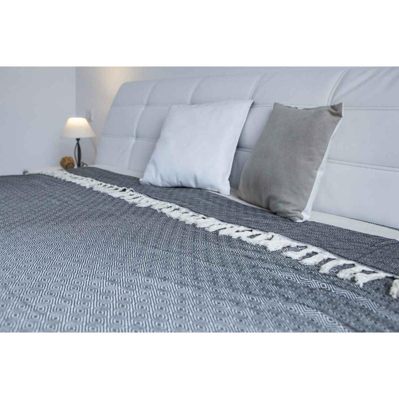 Multifunctional Turkish classic diamond blanket 210x235 cm. This well sized versatile blanket can be used as a bedspread or sofa cover as well as an XXL beach or picnic blanket or towel. The blanket is black and white and has a geometric diamond weave pattern with a classic, elegant touch. The 100% Skin-friendly, high-quality cotton is incredibly soft. A high-quality multifunctional blanket that brings modern design and freshness to your living space. It is Oeko - Tex® Standard 100 certified and has handcrafted fringes on the short ends. Please note that the Diamant Style Plaid shrinks very slightly after the first wash. Before washing, tighten the knots on the fringes so that they do not loosen during washing.