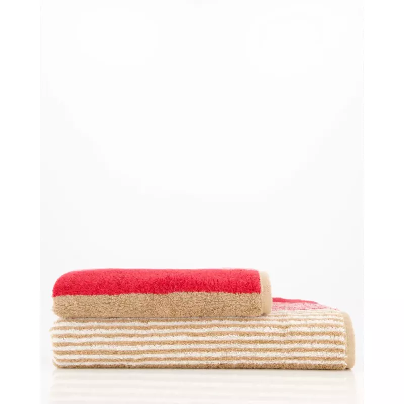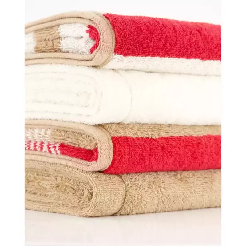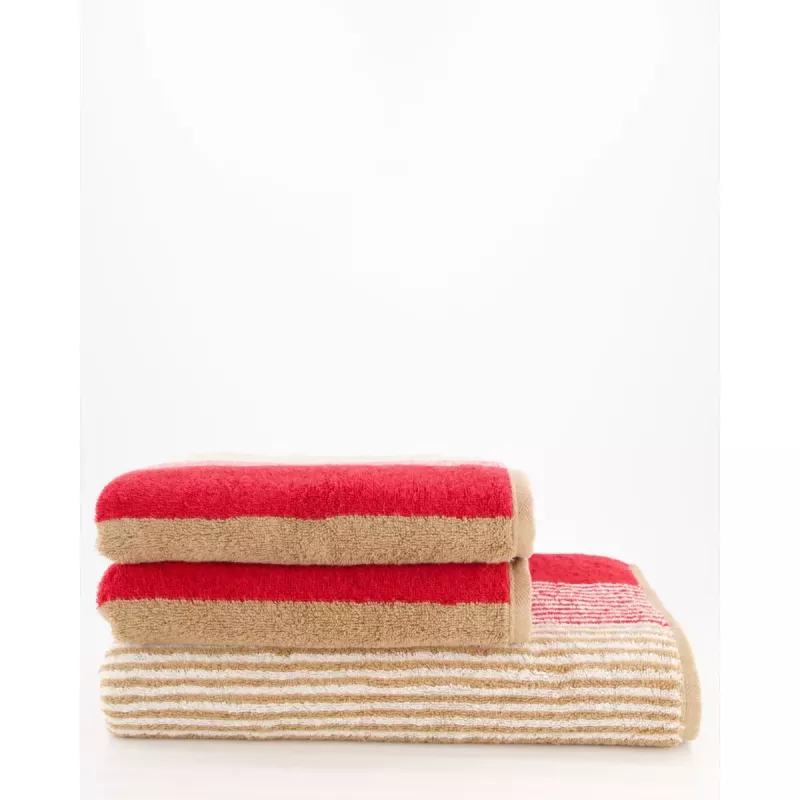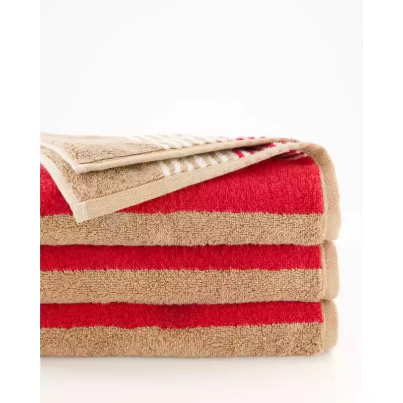 Design: Inspirerad av den moderna kustlivsstilen, erbjuder denna handduk ett bredt och iögonfallande randigt mönster i rika röda och naturliga toner som ger en fräsch och stilfull look till ditt badrum.