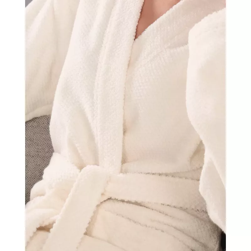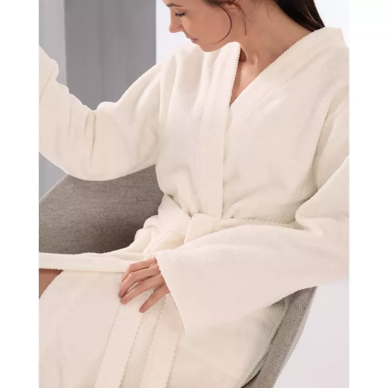Den högklassiga frottékvaliteten i 100% premium bomull omfamnar kroppen med en otrolig mjukhet och absorberande förmåga, vilket gör denna morgonrock till den perfekta följeslagaren efter ett avslappnande bad eller under en mysig morgonstund. Den klassiska kimonoskärningen och den naturliga färgsättningen ger en enkel elegans som smickrar varje figur, förstärkt av ett praktiskt midjebälte för en feminin silhuett.