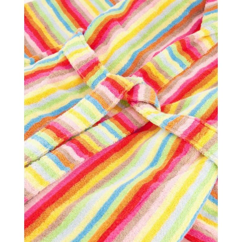 Denna badrock med lång huva av premiumkvalitet är särskilt mjuk och fyllig att röra vid, och den har två diskret inbyggda fickor för dina små, användbara badartiklar. Det matchande randiga skärpet ger både säkerhet och en charmig accent till din feminina silhuett. En dekorativ kant i horisontella ränder längs huven och morgonrockens öppning ger en iögonfallande detalj.
