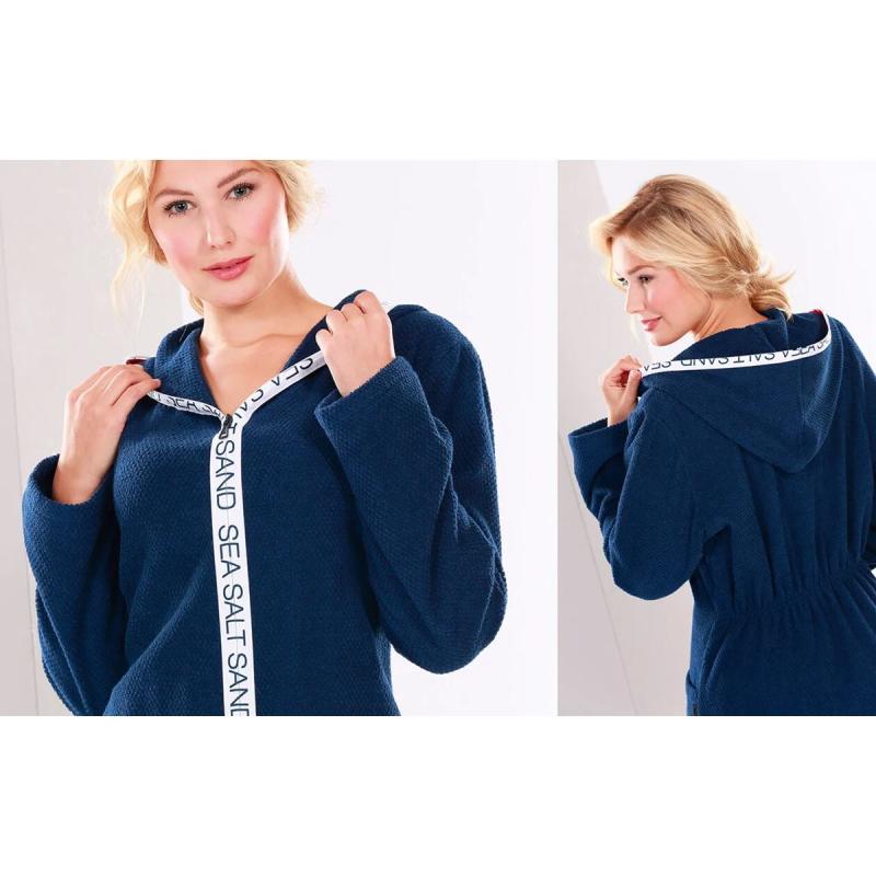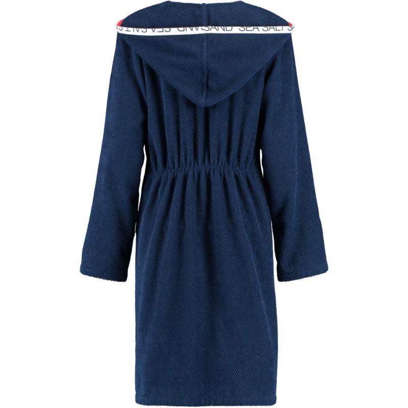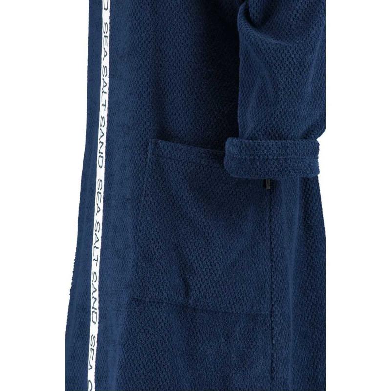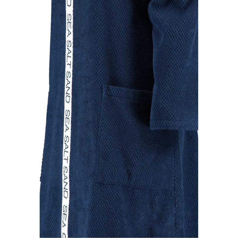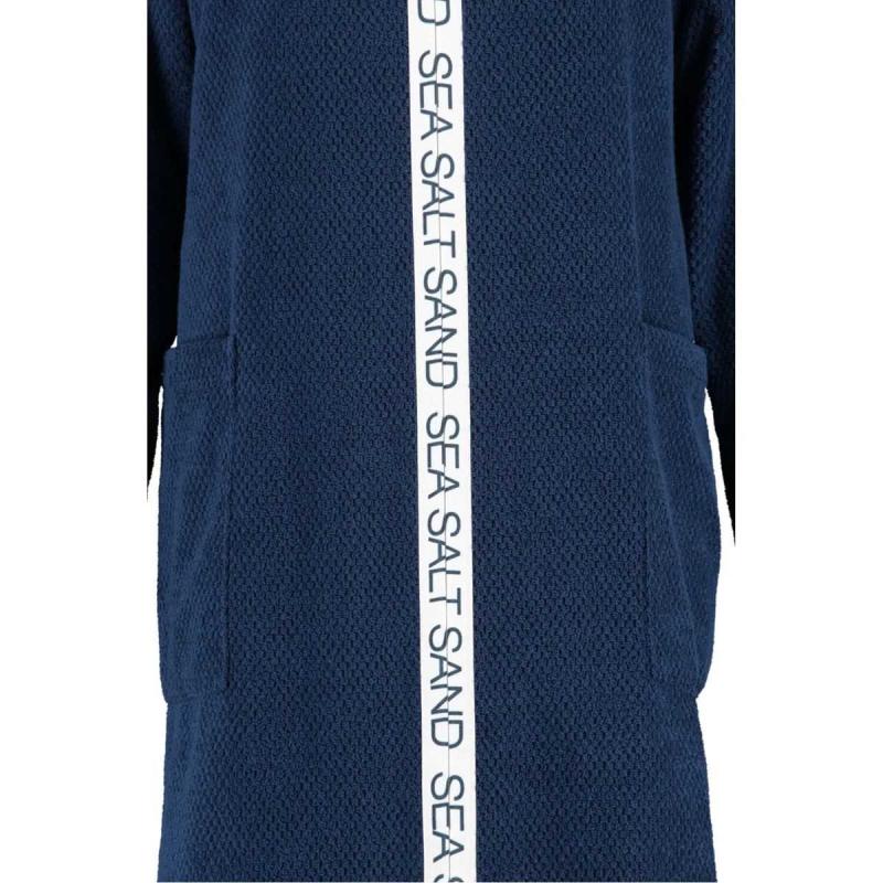 - Maritim look: Omfamna en nautisk atmosfär med denna badrocks maritima look. Den marinblå färgen och SEA SALT SAND-bokstäverna längs kanten ger en elegant touch, vilket gör att den sticker ut från vanliga morgonrockar.
