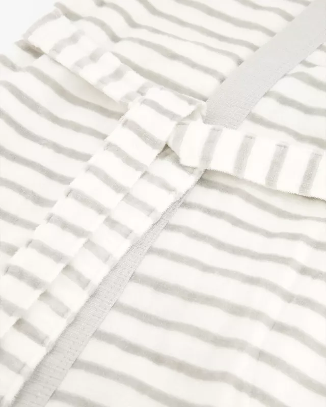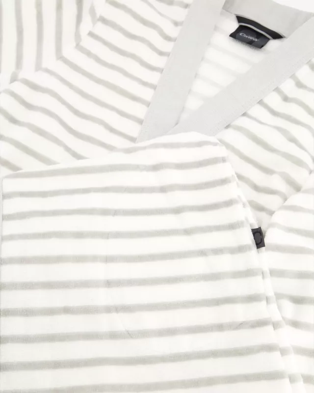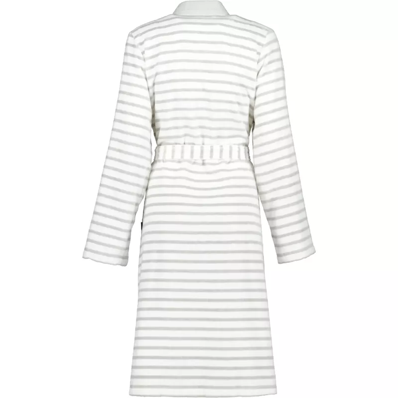 Design: Klassisk Breton-streifen i en sofistikerad silvernyans som framhäver morgonrockens elegans.