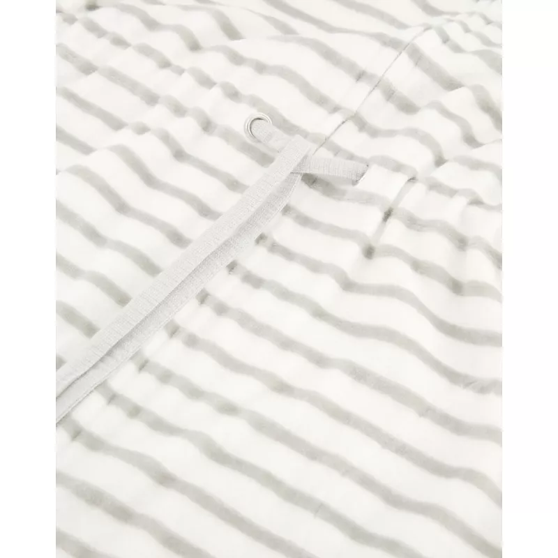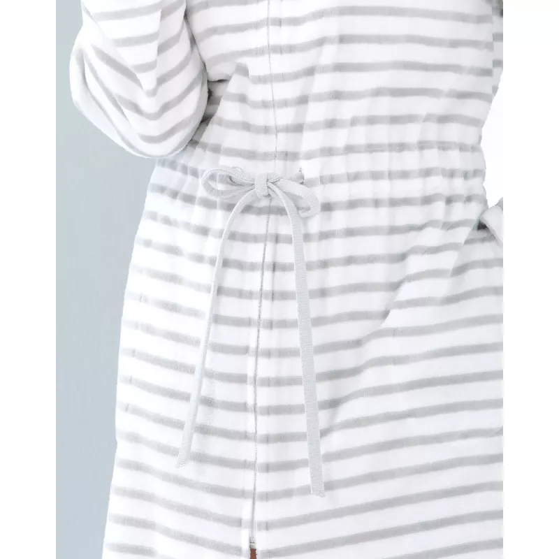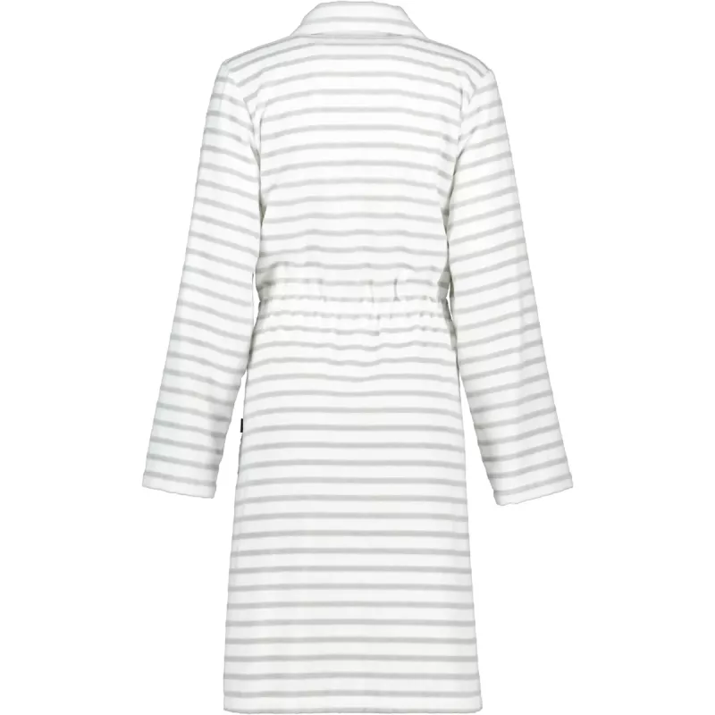 Design: Klassisk Breton-streifen i en sofistikerad silvernyans som framhäver morgonrockens elegans.