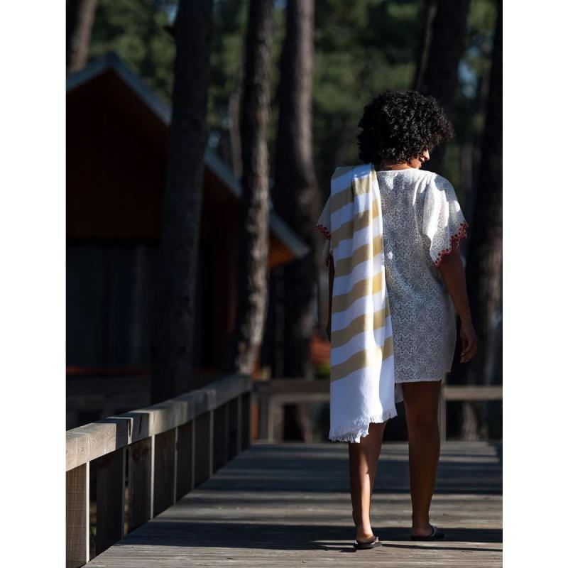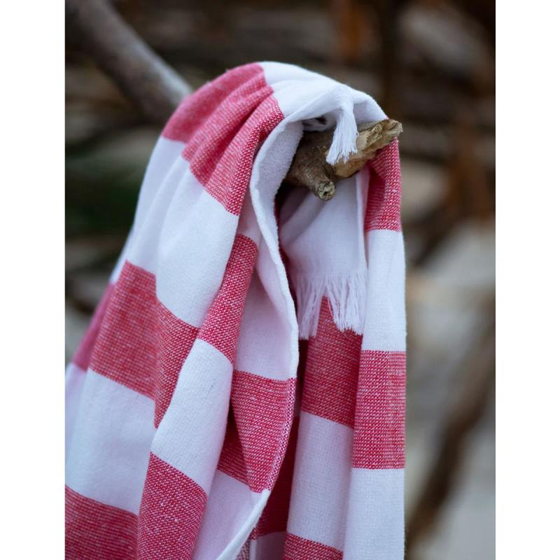 Som ett resultat av passionen för att leverera hög kvalitet med unika detaljer kommer denna Briciní extra stora XXL familjehandduken 180x180 cm Costa Nova. Hamam handduken har en frottésida med god uppsugningsförmåga och en sida med yta som hindrar att sand fastnar på handduken. Den tunna lätta handduken är tillverkad i Portugal av 100% bomull av hög kvalitet. Den är lätt att bära och otroligt bekväm. Hammamhandduken är perfekt som strandhandduk men också dekorativ och praktisk som badhandduk eller badlakan hemma i badrummet, vid poolen eller i solstolen. Den finns i 180x180 cm i färgerna mediterranean, mustard, navy och red och är även tillgänglig i storleken 90x180 cm, se relaterade produkter!