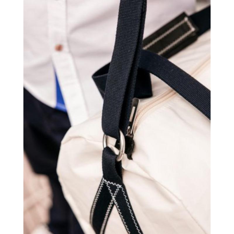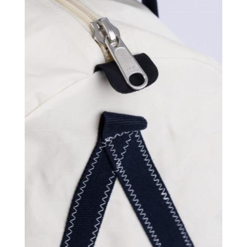 Varje Duffelväska Onshore Navy Blue är mer än bara en väska – det är ett stycke seglingshistoria, samlad och återvunnen i Frankrike med omsorg för varje detalj. Med Dacron-materialet, känt för sin motståndskraft mot ultravioletta strålar och dåligt väder, garanterar denna väska hållbarhet och stil under många resor framöver.