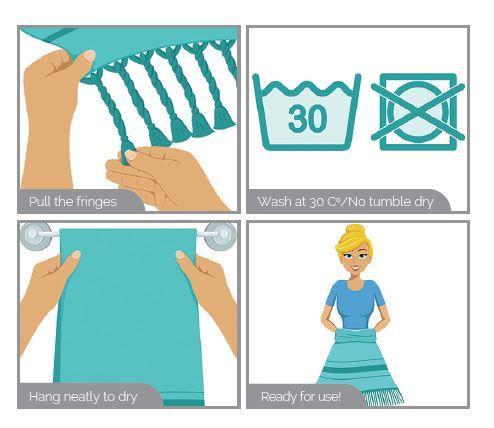 Behandla din hamamhandduk med kärlek så håller den länge. Behandla det som den hantverksprodukt det är. Tvätta försiktigt vid låg temperatur med liknande färger med en skvätt vinäger för att hålla färgernas lyster. För att undvika att den blir skrynklig, hängtorka i stället för att torktumla. Den torkar på nolltid ändå.