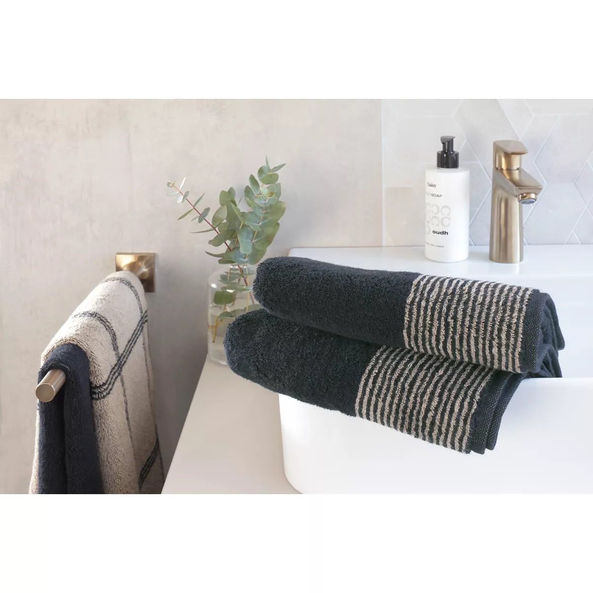 Ge badrummet ett lyft med Handduk Luxury Home Two-Tone Basalt 590-73 i serien Luxury Home Coll. / Two-Tone. Den är tillverkad i 100% bomull av hög kvalitet. walkfrotté med en kvalitet på 522 g/kvm, extra fluffig. vars grafiska mönster skapar en modern atmosfär. Den mjuka ytan omsluter huden och absorberar effektivt fukt. Ett medvetet val för dig som värdesätter hållbar textilproduktion.