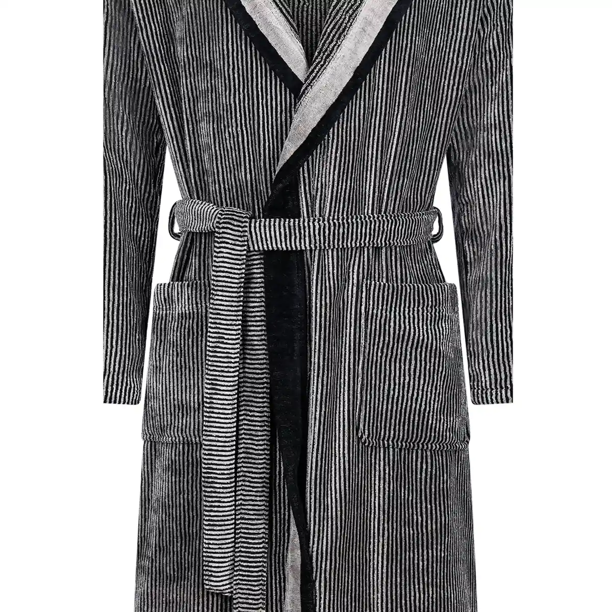 Njut av tidlös design och överlägsen komfort med Cawö herrmorgonrock med huva natur-svart. Denna exklusiva morgonrock kombinerar klassisk stil med modern funktionalitet och är tillverkad i 100 % bomull av högsta Walkvelours-kvalitet. Utsidan har en elegant, sammetslen yta, medan insidan i mjuk frotté ger en behagligt absorberande känsla mot huden – perfekt efter duschen eller en lugn morgon hemma.Den sofistikerade natur-svarta färgsättningen med subtilt randigt mönster ger morgonrocken ett maskulint och elegant uttryck. Den praktiska huvan ger extra värme och komfort, och den klassiska passformen med knytskärp i midjan ger en stilren silhuett. Med en längd på cirka 125 cm erbjuder morgonrocken både täckning och rörelsefrihet.