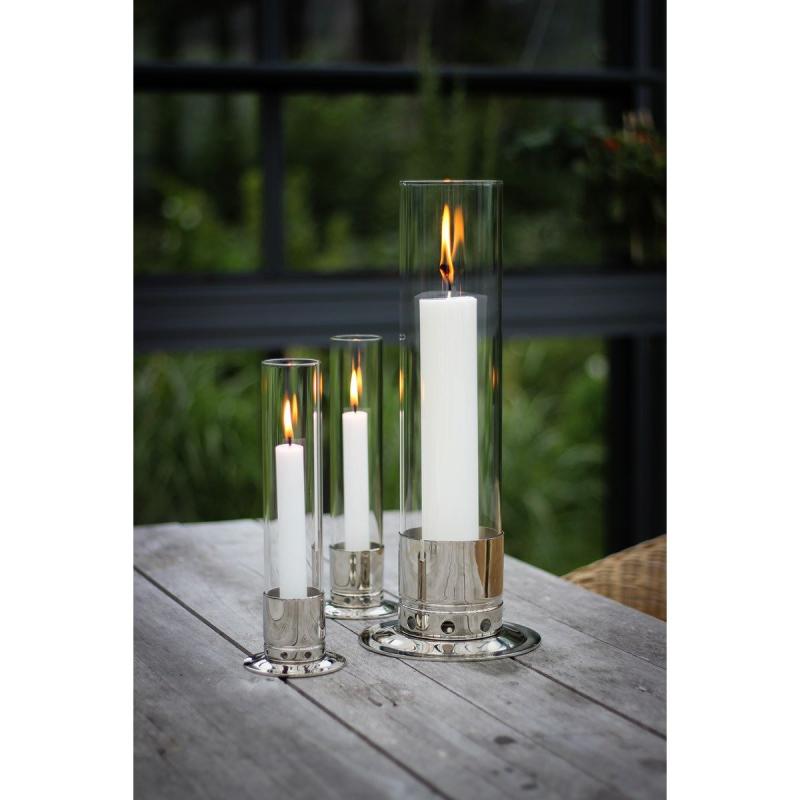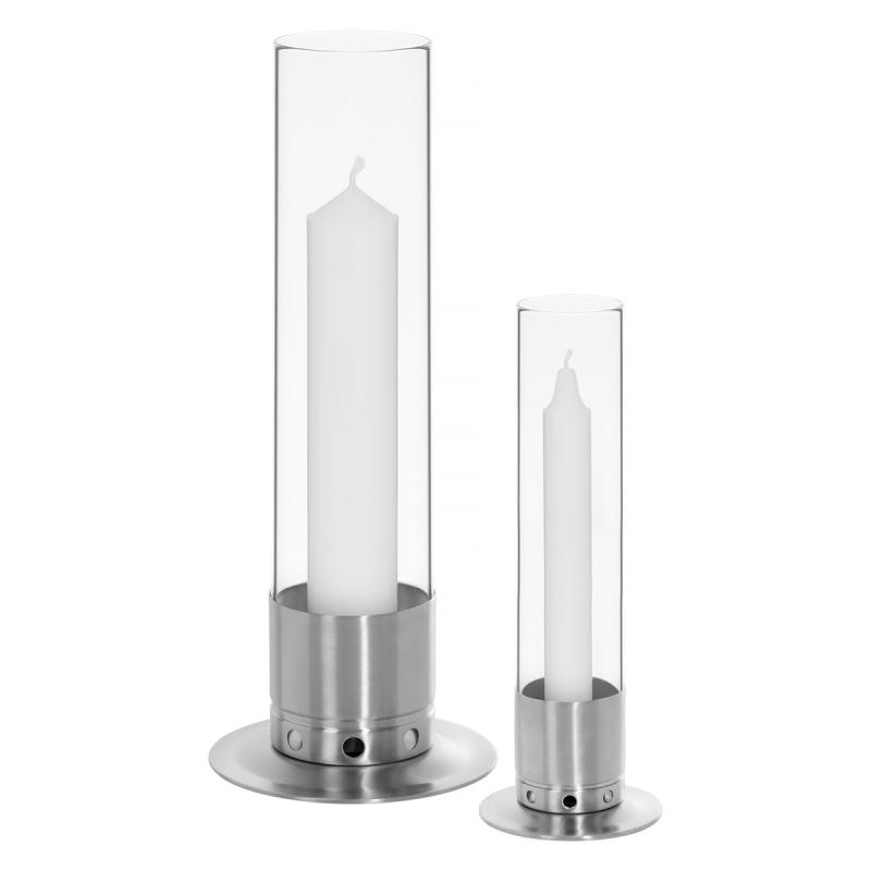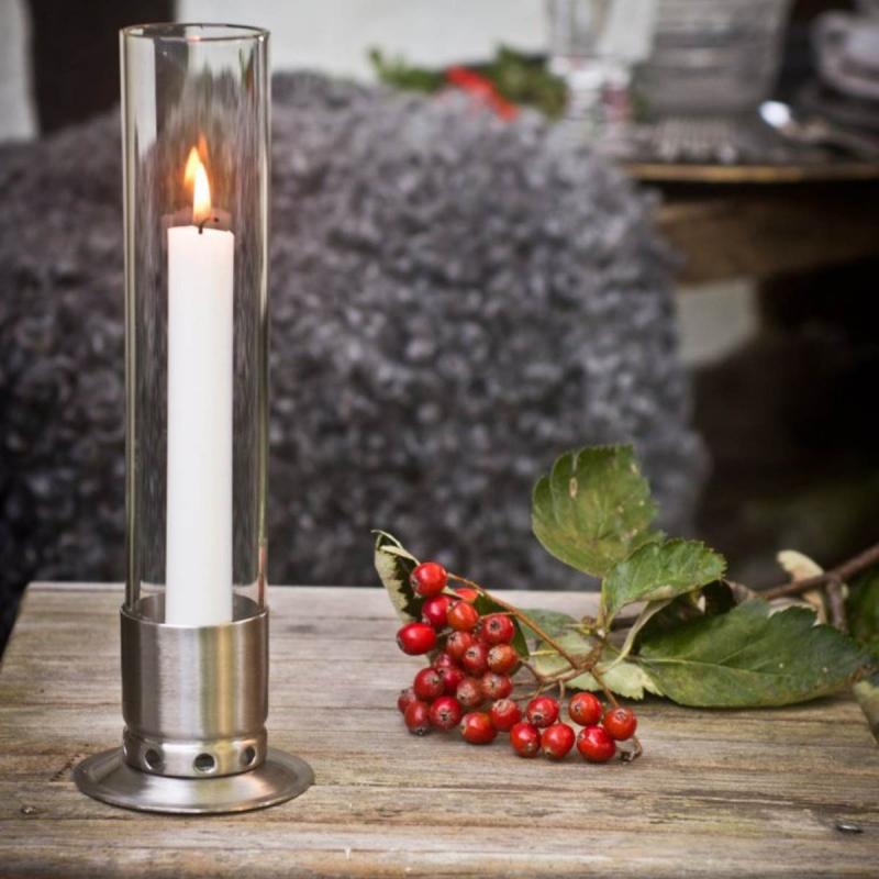 Från Kattvik Design kommer denna dekorativa och praktiska ljusstaken Kattvik large i borstat rostfritt stål. Ljushållaren är utrustad med ett vackert stormglas som hindrar ljuset från att blåsa ut och som också hindrar att det börjar brinna. Ljusstakens stabila fot gör att ljusstaken står stadigt, även i hård vind utan att ta upp stor plats på bordet. Den kan användas såväl utomhus som inomhus I många olika miljöer hela året runt. Denna stora variant av ljusstake Kattvik är anpassad för 300 mm ljus med diameter 50 mm med brinntid på 50 h. Den praktiska ljusstaken passar förutom på restauranger perfekt för ett dekorativt inslag hemma och kan med fördel kombineras med den mindre modellen av Kattviks ljusstakar.